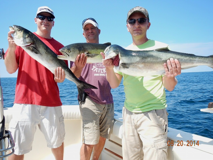 The Nick Bechtel charter was on board today. Along with nick were friends Jason, Evan, Kitt & Justin. Paul ran east in the AM to the spot where there was a good bite the night before but the area showed no signs of life. After an hour of Chumming without a touch it was decided to run north to the Mud. The fishing for big Blues was good in the AM but was beginning to slow down as we arrived. The Blues were wire shy and we only got our bites after going to 30lb leaders. We got over a dozen bites but only managed to boat 3 Blues and one 23" Fluke. The weather was perfect and we had a good time with a great crew.