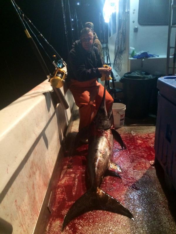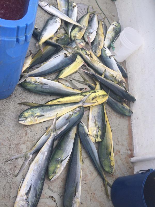 Headed out Monday morning for the canyon. Tried trolling but that didn't produce except for some mahi. Anchored and chunked into the morning. Got one long fin on a jig and one on the chunk. Several misses. It was cranking out there with a solid 5' chop. We where happy to be on the "Mimi tank". Hooked into a nice sword around 5:00 and had him in the boat in 20 minutes. Went on the troll a little while later to find the mother load of very nice sized mahi. Managed 40 plus. As always, Capt. Kenny, Chris, and Bob worked hard. Great trip in my book.