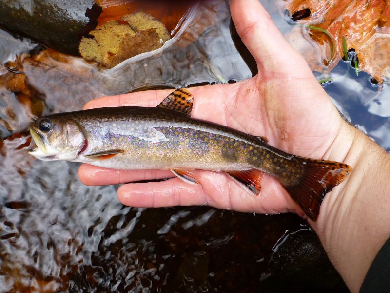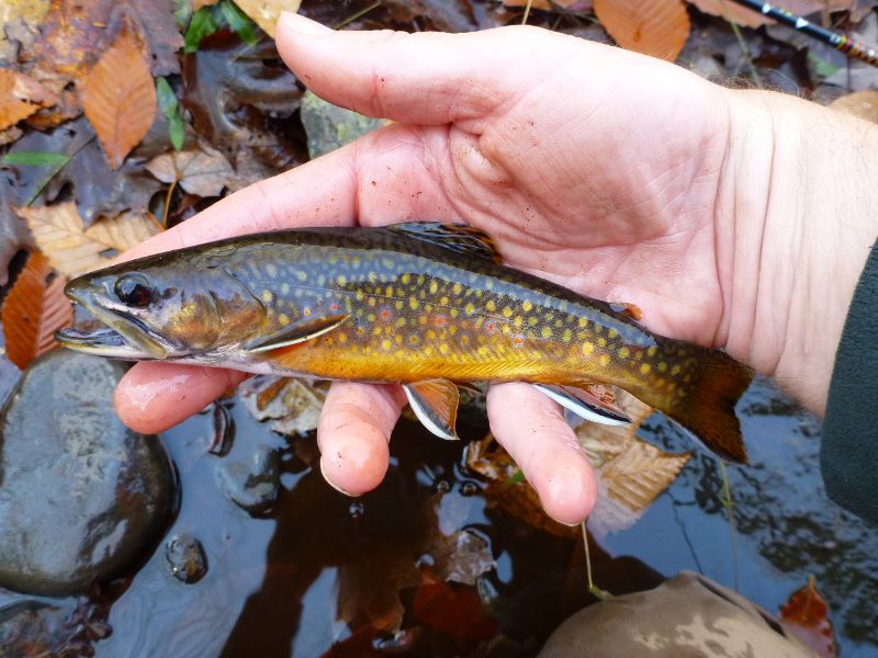 I fished a small trib to a reservoir seeking colorful brookies. Didn't find many adults - caught 14 little guys in the 3-4" range - but did get a nice-sized doe and buck fish. Does have the rounded snout and not as brightly colored; Bucks have the more sharp snout and brightly colored with the orange/red flanks.