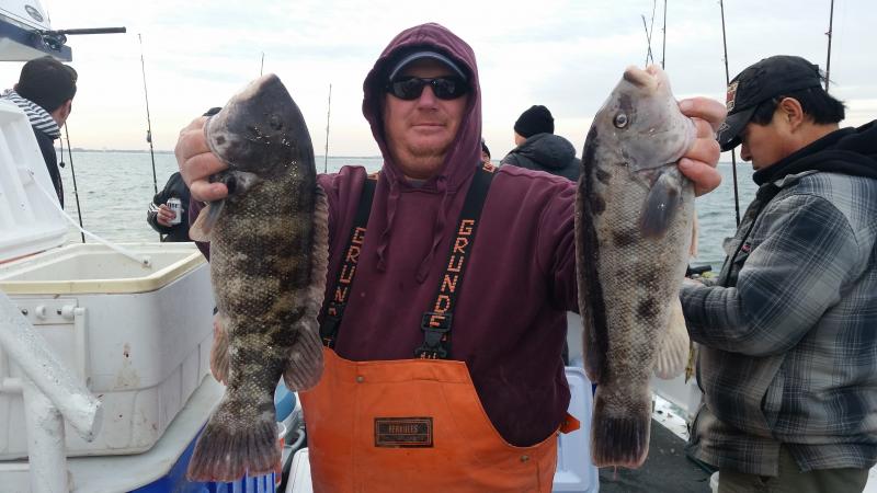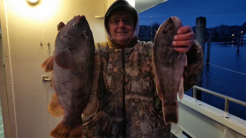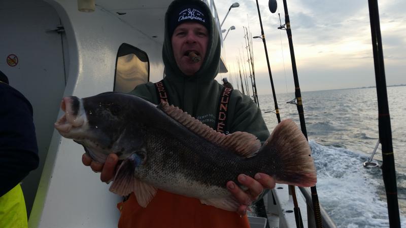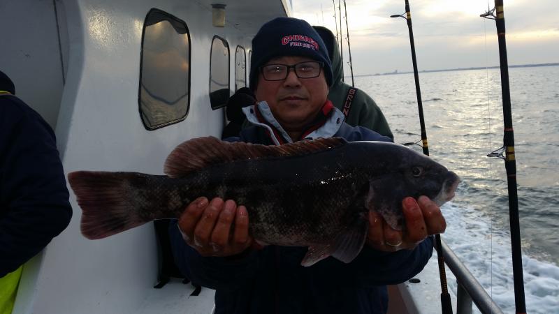 12-4-14 We had a good day weather wise,,very nice and calm out there,,,Fishing was good for some,,,High had almost a double limit,,we had some with 6-8 keepers,,,but I also had a lot of guys who got skunked,,Yes it is normal for some to get skunked,,,especially blackfishing but its not something I like to see,,,I also had a spread of guys with 1,2,or 3...just some guys were in the right spot when they were chewing and they dialed in,,some were new to the game and some were not on there game and were just missing them...Good portion of the fish today were nice,,,quality in the 4-7lb.range..Pool fish was spit between 8lb.fish and one about 7lbs.I think we could have even done better if the dogfish were not a problem,,,they were at times a pain in the butt....Either way a nice day out with a great bunch of people!!Looking forward to tomorrow already,,it looks good...See ya in the morning...pics.