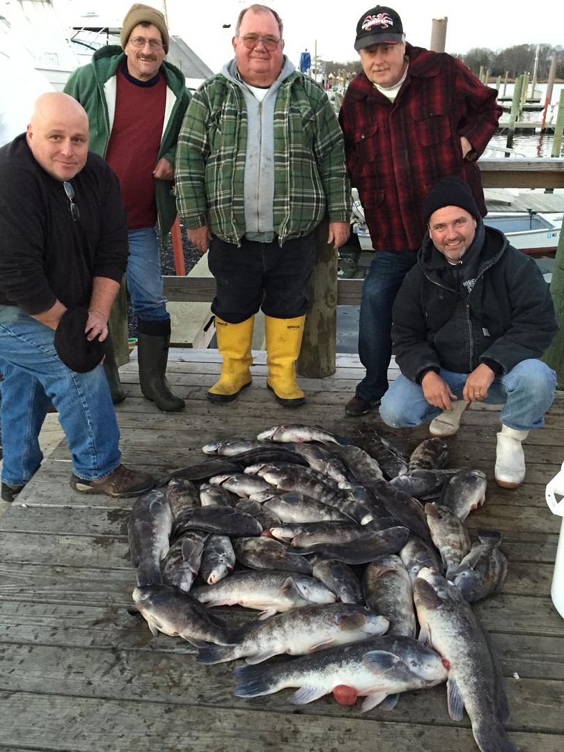 Monday 12/15 open boat crew of 6 for blackfish. Tried an area we haven't fished yet this tog season. To make it quick and simple, bad move. Screaming tide made it difficult. Did catch a couple shorts, a keeper and some Berguls. Second drop was very slow with bites coming in flurries. Managed to put some keeper togs in the box but nothing of real size. Couple wiggles but it was the same. Next drop some nicer fish starting to chew. But again very slow and boring. But the flurries of fish kept ya fishing. Did sit on this last drop till the end of the day and the guys did manage some very nice sized fish ranging mostly from 3-5lbs, and boxed an 8 and 9.5# blackfish. By day's end the guys did scrape up their 6 man limit of 36 keepers. Well done boys on another tough day.