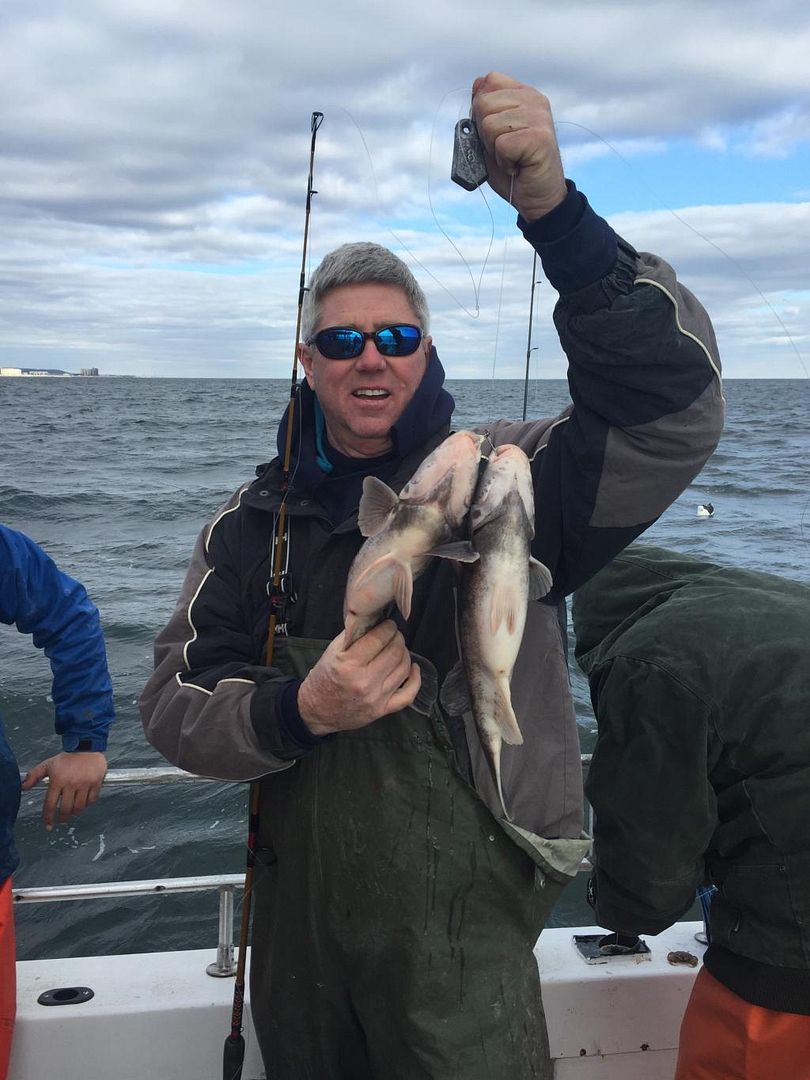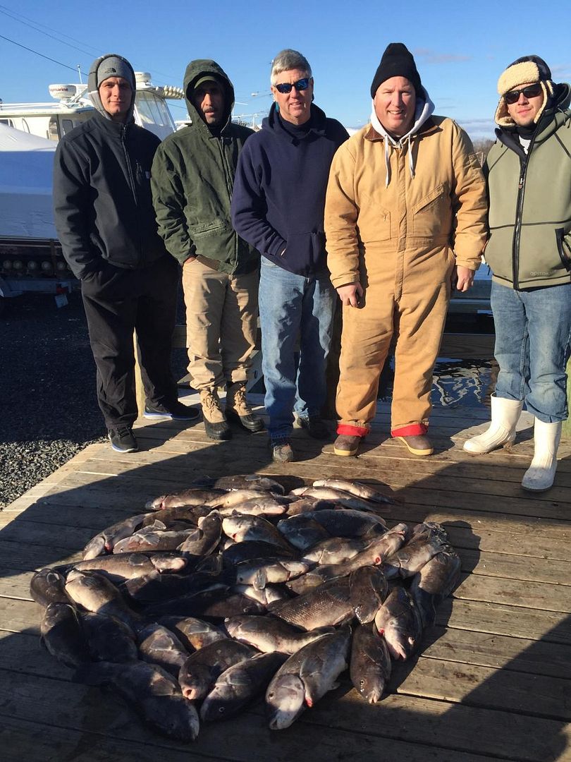 Thursday 12/18 open boat crew of 6, one guy not pictured. First drop wasn't very good at all, so we made a move. Lights out blackfishing on this drop. In 3 hours the guys put a beating on these fish. Ralph's first tog trip he had 13 keepers to 8lbs including a double header keepers. But Joe T put on a show catching 18 keepers himself! Drop and reel. Mostly 3-5lb fish today. Excellent fishing. Total tally was 57 keepers to 10lbs(which was released, by the Capt), all before 1pm. Obviously only keeping our 8 man boat limit of 48. Hell of a job boys!