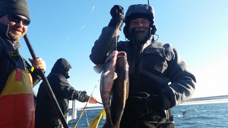 Considering the tough conditions with the wind current and cold it was a good day on the blackfish grounds! Picked away all day at good quality fish... just about all nice size roasters...at times the conditions made it tough but when ya got a bite it was usually a good one. Looked over n seen the quiet Kurtis Berry rod doubled over n up to the net came another Monger Monster at 12 1/4 lbs he also had a double header keeper including a 8 lber and 10 keepers. Phil was hi hook with 13 and 76 year old first time togger John stayed at the rail all day n managed his limit ( n out fished Stelios Gatanas) Some guys struggled but everyone contributed to the box wound up with 56 keepers just a few short of the guys 10 man limit. Give the guys alot of credit it was windy n it was cold but the reward was a nice box of fish. Back at it every day we can. Thanks again guys