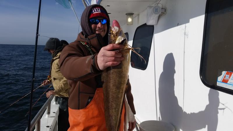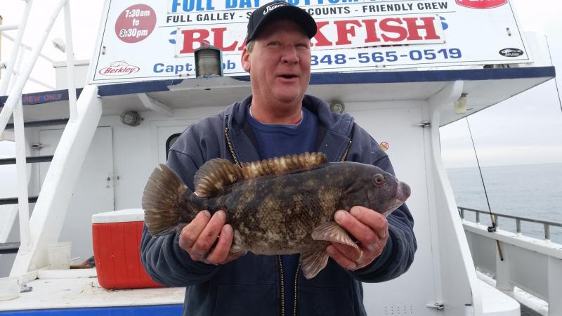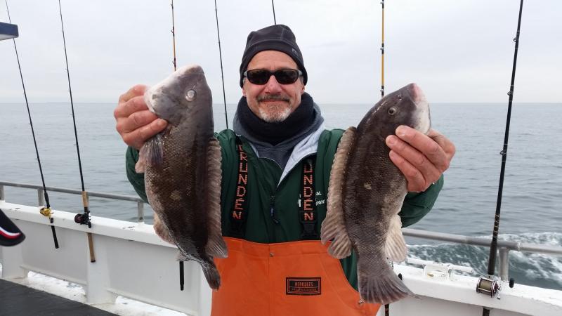 1-27-15 We had a very chilly start to the morning today but it was worth it cause the winds were light and the ocean was nice and calm...Fishing was slow for us again though,,,we covered some ground and depths looking for a good chew but did not find it...3-4 keeper Togs onboard,,,maybe a dozen Codfish came up but all were short,,,dozen or so lings,,,fair amount of banana cods,,,not many dogs,,,,some spots had the gizzy life but alot did not,,couple of small pollock..Joey and Willy ended up at the pool scale,,Joey ended up winning the pool with his Tog,,Willy had his two keeper Togs on clam today,,keep that in mind for sunday,,,So the potential is there just need a few days of calm seas to get it going again...No fishing tomorrow or Saturday due to the gale force winds and freezing temps...Sunday as of now is the next nice day to fish,,see ya then..Any questions give me a call...pics..