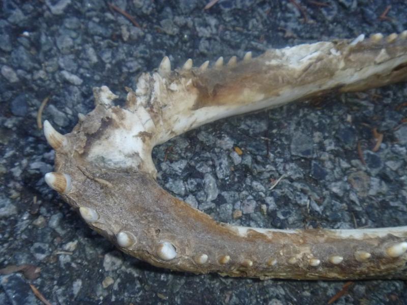 My neighbor found this lower portion of a jaw of a 'mystery animal' at a shoreline of our local lake. It is almost 14" long and the skin resembles pattern of a pickerel. Care to comment? This is not a goof