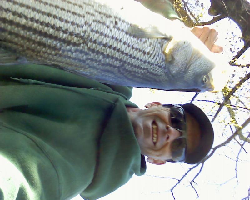 Switched to heavier rod with 15lb braid and a husky jerk. Before my nerves had settled, my drag was tearing again. I put SERIOUS heat on this time & got striper in picture, about 25". After a dry spell, a REAL bruiser hit. Another long battle, putting CRAZY pressure on (Power pro is good), thought rod would break... but everything held up. Needed 2 cold hands to land the beast (about 29"). Couldn't hold well for pic. Wiped out, I didn't take another cast and went home. ![]() |