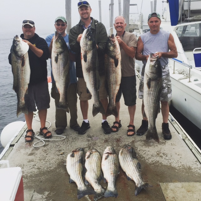 Had the Pike County Outfitters this morning out for some bass fishing. Loaded the wells and once we got to the grounds had some of the best readings of the year. Got set up and went 1 for 2 on our first drift. Had a few drifts where we had multiple hookups. Was able to land 5 keepers on the livies. Put out the TGT spoons and before we could get out the second rod, had one on. Finished the day landing 6 more slobs. All the fish today were between 28 and 45 lbs with 3 fish over 40 pounds!!! Total for the day was 11 keepers landed only keeping our legal limit with three biggest fish weighing 41, 42, and 45 lbs, and the biggest two being released.