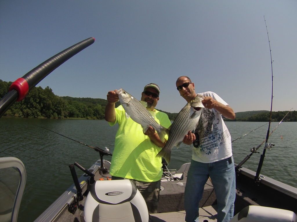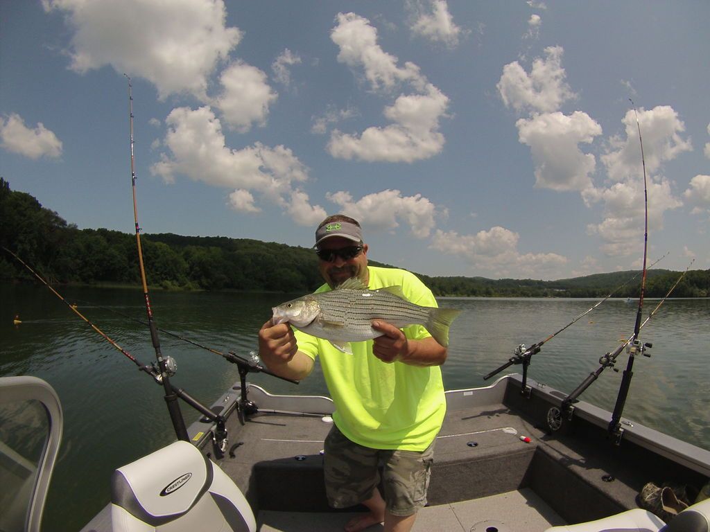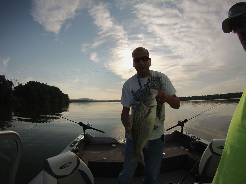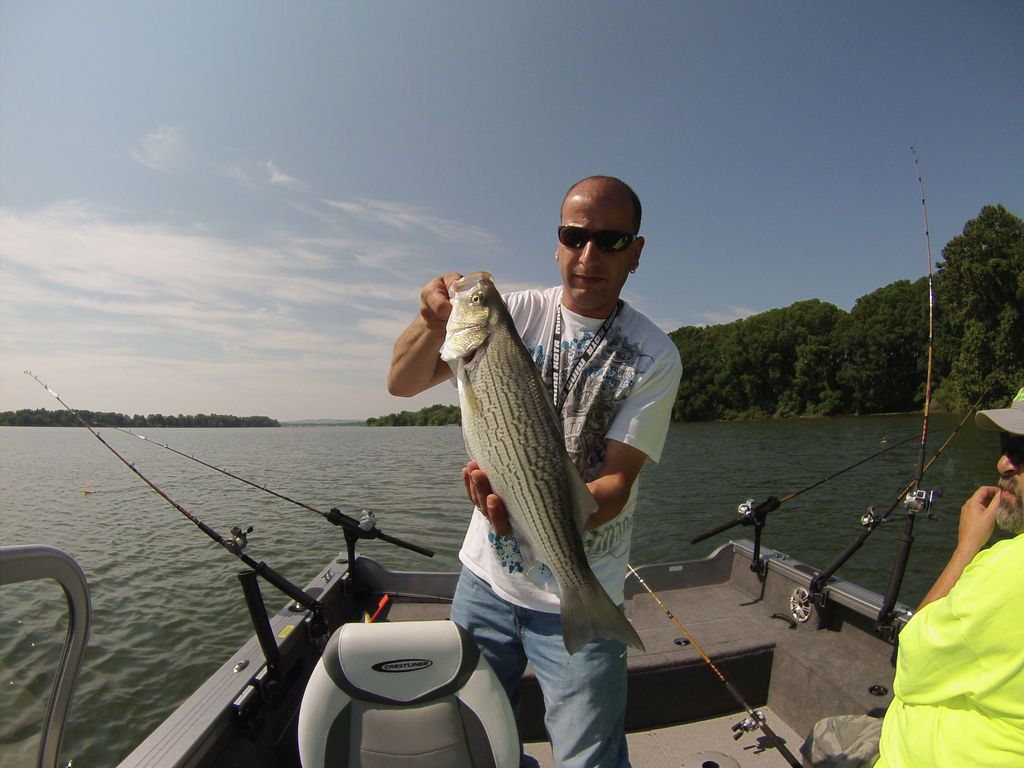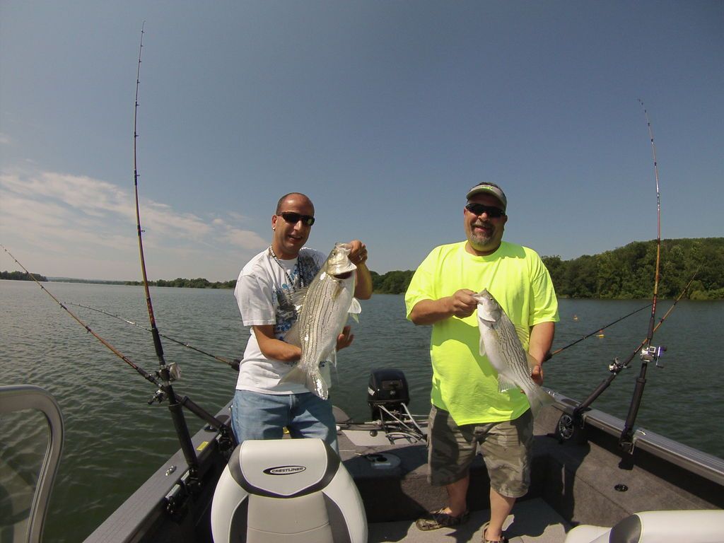 Met up w Dale early morning to fish for our fav species...the early bird gets the worm haha. Got the boat in the water quickly and headed to where we wacked em good last weekend in the pouring rain. Picked off a nice fish while setting the 2nd line out and had good signs of life in this area. We were thinking it was game on but we had no takers just alot of lookers and decided to go into search mode. Scanned some areas we know to hold schools with the side imaging and found no bait and no fish anywhere around. Made another long move and instantly found plenty of bait and some loosely schooled stripers after searching for a while. Setup a 6 rod spread and it was game on the rest of the day making loops thru the waypoints. We had a few doubles and triples and we lost quite a few fish to short strikes and sideways tangles, seems this years class of fish is thicker and they are running sideways while they dig, fun fun fun lol. All fish caught in 15-25fow slow-trolling naked herring rigs w snap weights on planer boards and downlines. Got the new boat finally rigged the way I want and shes getting broken in nicely......Enjoy the fish porn fellas