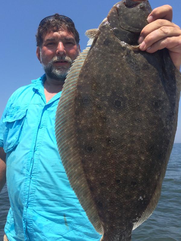 Took Jake, my oldest, out on Sunday. Got on the water around 8 and headed east. We were pickin some shorts and I was starting to think where we were gonna try next. The. My rod did the "old double over". I look at jake and tell him to reel up and get the net. it's very rare for me to call for a net before I see the fish, but this felt good. The fish took three bluefish like runs and then came up. Jake has never netted a fish but it was too big to flip. It looked huge when it was two feet under water (I'm gonna buy a hot tub). Jake scooped it up and a nice fat seven pound fish hit the deck. Not a doormat in any way, but it certainly fought like one. The drag screaming runs were great and I thought it was a fluke the whole way. I got another keeper 18 inches and we both picked a couple of shorts. I decided to make a move and head south towards Scotland.