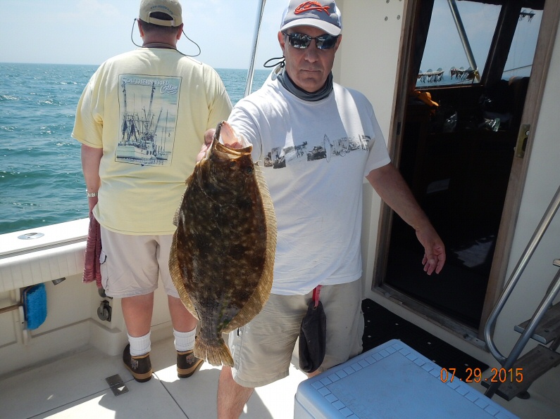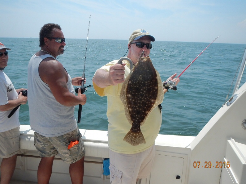 Capt. Paul ran an Open Boat Fluke trip today. On board we had Dwight, Carl, Mark, Tony, Mark & Bob. Paul decided to try the waters south of our Inlet today. The ocean was dead calm in the morning with little to no drift but the guy's put 5 nice Fluke in the box while releasing over a dozen shorts. By Noon the wind was coming on and our drift was to fast. The crew hung in and finished the day with 9 Fluke. It was not great fishing but again it was an improvement over what we have had the last few trips. There are plenty of Fluke around we just need the conditions to start putting some great catches together. Check the Open Boat Forum for our next scheduled Open Boat Fluke trips during August.