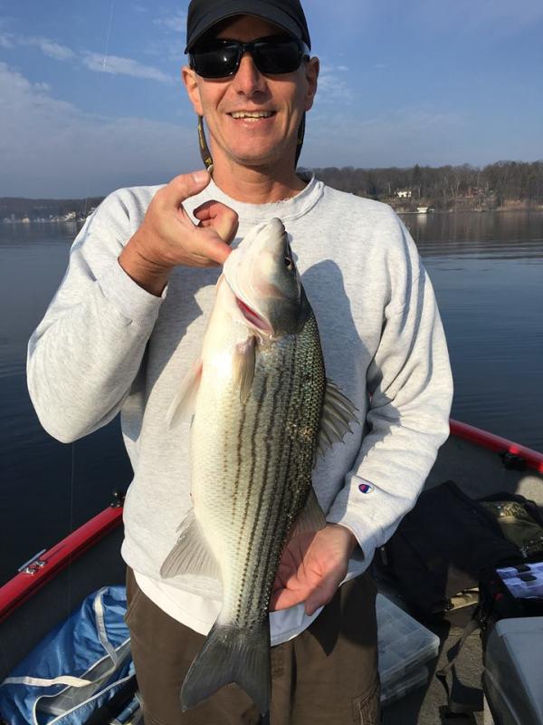 actually we jigged our butts off from about 7 to 9...with just a couple of white perch...we then started trolling with downriggers. we immediately got the bass. reset and got the eye. that was it. the week before we had well over 20 fish jigging with another big bass and eye mixed in.