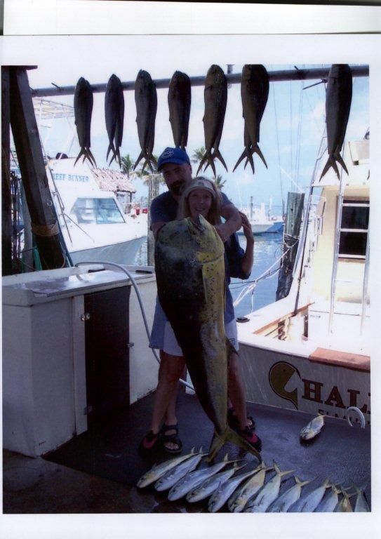 That's a very cool shot of your wife with the dolphin. I've always thought about jumping in with them at the canyons when they're around but the amount of shark out there at times and concern what they might do always brings me back to my senses! Would be awesome experiencing that in a more controlled environment. Nice bull dolphin also.......that's a big fish.
