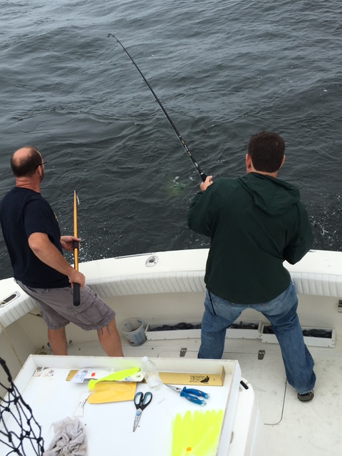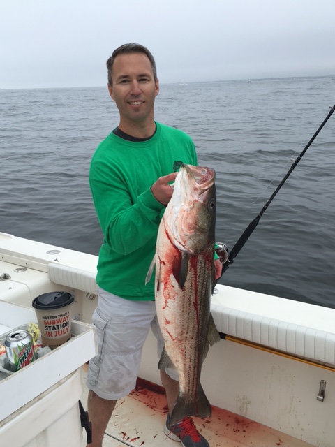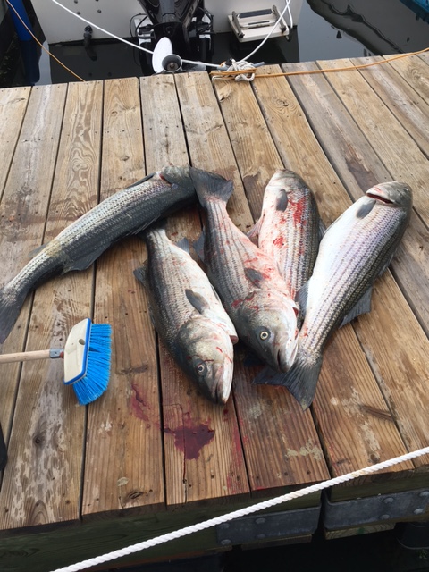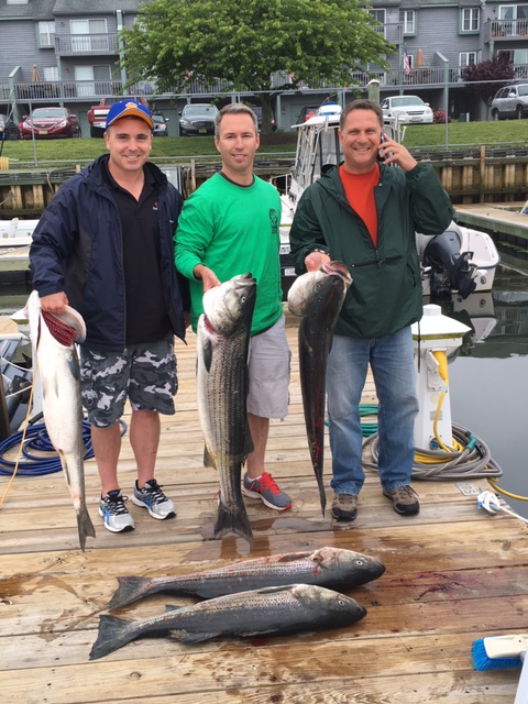 Today we had out a few guys who were part of the Tournament out of Bahrs for the Wounded Warriors. We were hooked up with our first bass before the second rod was set. Landed a nice 25lber. put out our third rod after and had a couple hits and then landed our second. Lost another one half way to the boat, and then boxed up our 5th bass around 11:30. had all our bass between 20-32lbs and stuck with the troll, which paid off for us. Tons of marks all day, some bait but not as much as we've seen, and a few of the bass had bunker hanging out of their mouth when they were boated.