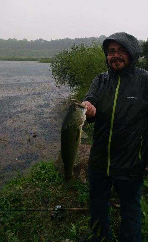 Yesterday hit a local Pond right before the T-showers. As soon as we reached the water, the rains began. Had rain jackets so it wasn’t terrible. But our pants and boots were SOAKED within seconds. Lighting and thunder all over the place. Almost turned around and said F-it. But then my cousin landed a nice 3+lb LMB using one of those live target Sunfish top water baits. Pretty awesome fight and thrashing that fish put up. After getting soaked for another 10 minutes or so, it was down to a light rain. Then the sun came out and a double rainbow overhead. Can’t beat that!!! Simply amazing. He fished a heavy football jig, purple and black and landed 4 more LMB. I fished a nightcrawler colored Gulp worm and grub. Landed 5 fish as well. One in the 2lb + range (pic 3) and as daylight ran out on us around 8:15pm, what appeared to me to be the biggest fish of the evening. Ide say 3.5lb +. Hard to say in the darkness.