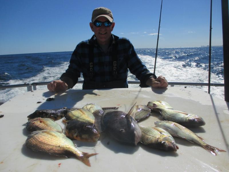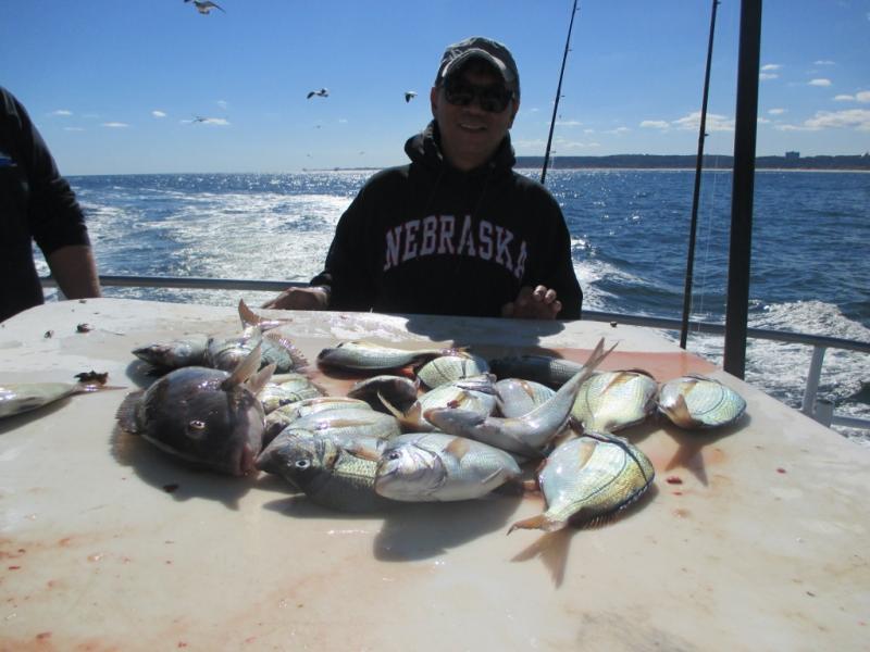 We fished a different area today and only made one move at the end of the day . We could have stayed where we were but I wanted to check out a drop close by for tomorrow. We had crabs and everyone on board was more interested in tog than porgies and were happy to keep one black fish and play catch and release. Jose Rayes from Garfield won todays pool with an 8 pound tog and through back 20 smaller fish with many that were legal size. I was the only one fishing with clam for most of the trip and there were plenty of porgies. Towards the end of the trip a few switched to the soft bait and also caught. Everyone had there keeper tog and 5 to 20 porgies. It was a fun day with plenty of action. It is a shame that we can't keep sea bass and more tog.