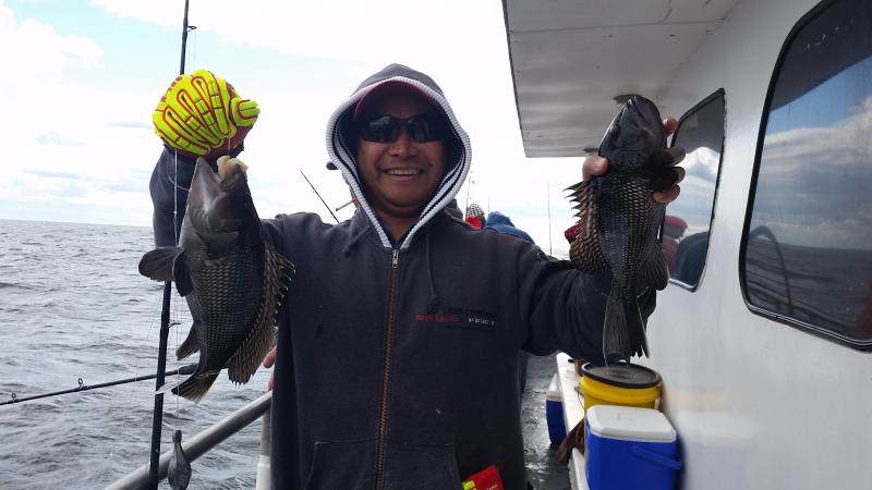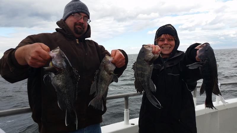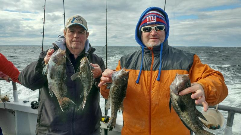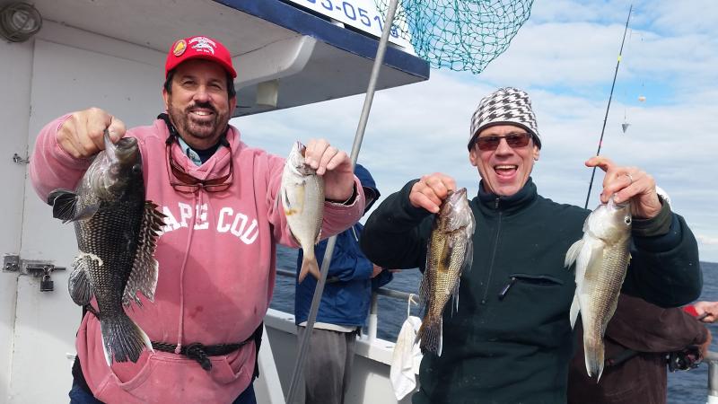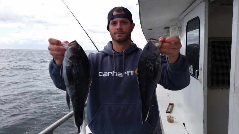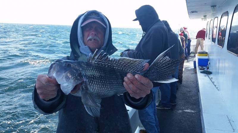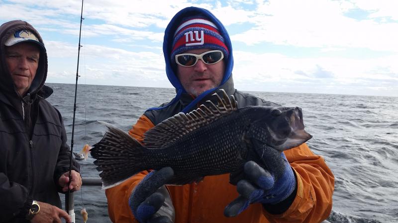 10-25-16 Nice day out,,every drop we had the sea bass coming,actually very good fishing,,,again you had to work around a ton of short life but slowly we banged away at the keepers and at the end of the day most had a nice catch of fish for dinner....Fishing up off the bottom helped get some of the nicer fish,,,if you fished on the bottom the whole time you did not do as well with the keepers...also saw some porgies and a few winter flounder in the mix as well..and still some fluke around as well..Water is still very warm...Nice day out,,tomorrow looks good as well...check out some pics