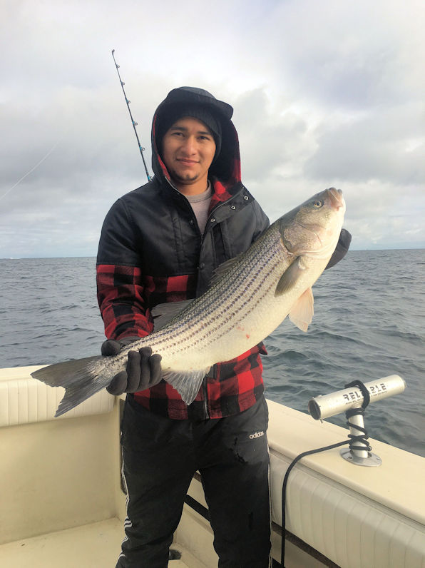 Paul had the Librado Popocatl charter on board today. Along with Librado were Edgar, Jovanny, Junior, Louis & Greyono. Paul got an early morning start in the rain and made his way to the Bass grounds. Finding some solid Bass reads and having a crew that was not into casting we put out the Shad Rigs. The first Bass was on in a few minutes and the bite never stopped. The guys went on to Troll up 28 Bass. They boxed a boat limit of Bonus Bass along with a boat limit of Unders up to 38" and 3 Bluefish. By 10AM the guys had enough action for 1 day and asked to go home. It was a good day with a good crew and we all got home early.