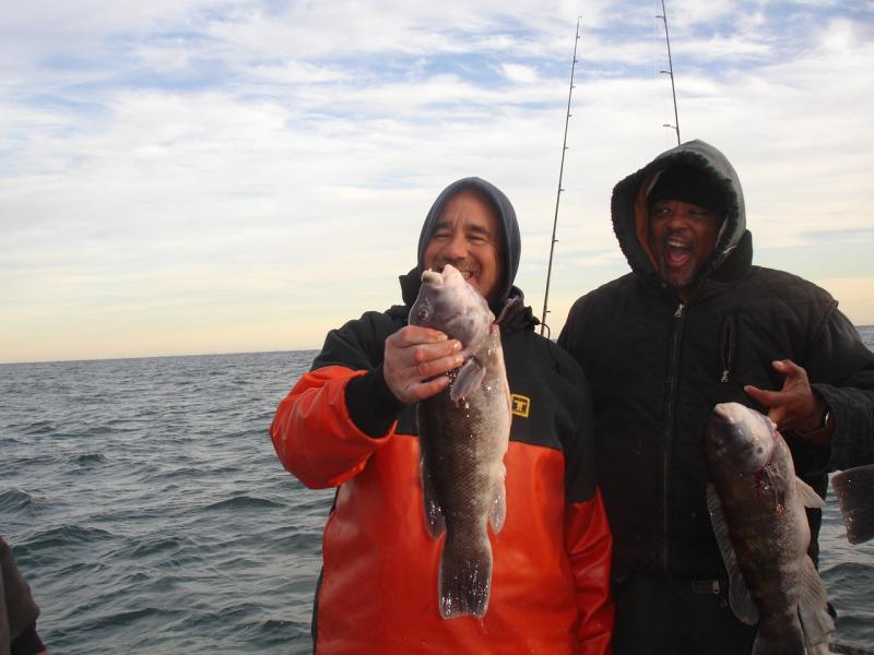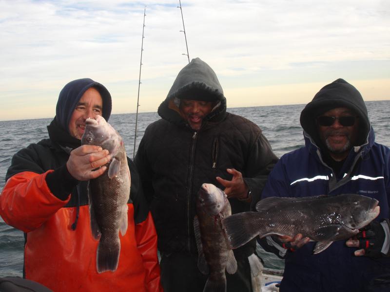 (monday) This A.M we ran a charter for Jeff and his buddies for a day of Togging, we hit three drops for the day with life on all the pieces. We fished depths from 50 to 75 ft and the shallower pieces were better. Some of the Tog were off on the color, not sure if it was from the blow the day before or the water temperature dropping or both. We picked and plucked all day with keepers and a lot of short action, most of the shorts just missed the mark real heartbreakers. The weather was a little nasty in the A.M with the cold and a stiff wind but by day's end it was nice,it was the first day we made ice. The charter finished up with 23 keepers for the day.