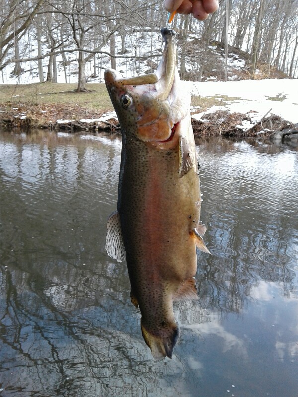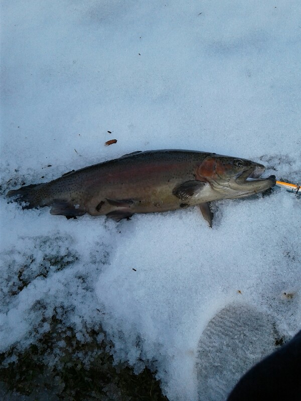 I worked from home today and snuck over to Echo Lake park for a half hour or so of fishing during my lunch break. I have been gunning for a Fall Stockie at Echo since Nov. with zero luck but I guess today was my lucky day. I decided to avoid the dam area where everyone fishes and instead started casting a small husky jerk in one of the few open water spots at the head of the lake. My second cast snagged the nice stockie pictured below. This was by far my biggest trout and my first caught in the winter months.