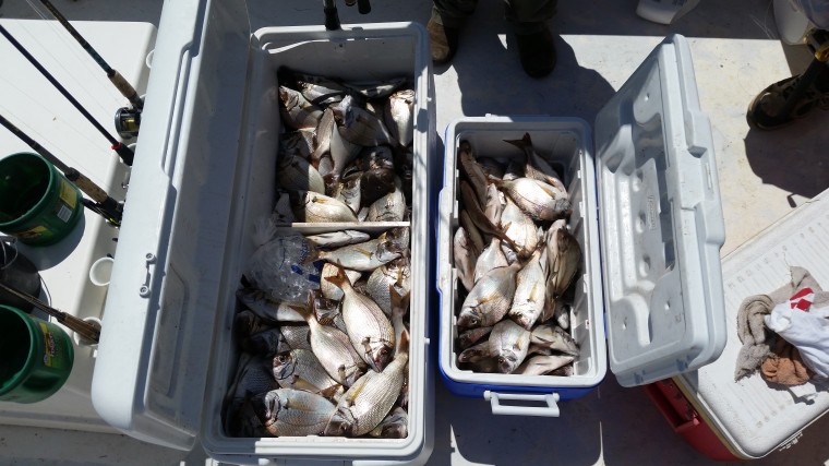 We had Tautog and Ed H + his party of 4 for a day of strictly Porgy and C-bass fishing. Tautog is still 'King of Porgy Hill' but Renee was right on his heels all day long, pulling up loads of double-header keepers. With 6 anglers, Capt Tom and I didn't get a chance to fish. If we did, we'd still be at the fillet table!