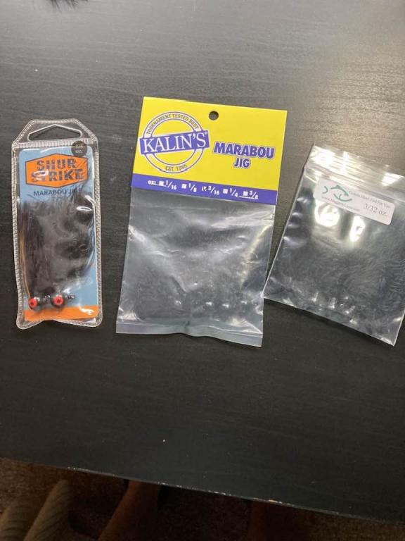 The Shur Strike are a bit too heavy @ 1/4oz. I just ordered the Kalins on line (as much as I hate shopping on line) still just a bit too heavy @ 3/16oz. but I think I can file the heads down, they have an awfully large hook also. I still have some Haggerty jigs at 3/32oz which is perfect, unfortunately Haggerty no longer makes jigs. Splitting hairs, yes !! I have to get to Sporting Life to see what jigs they have also.