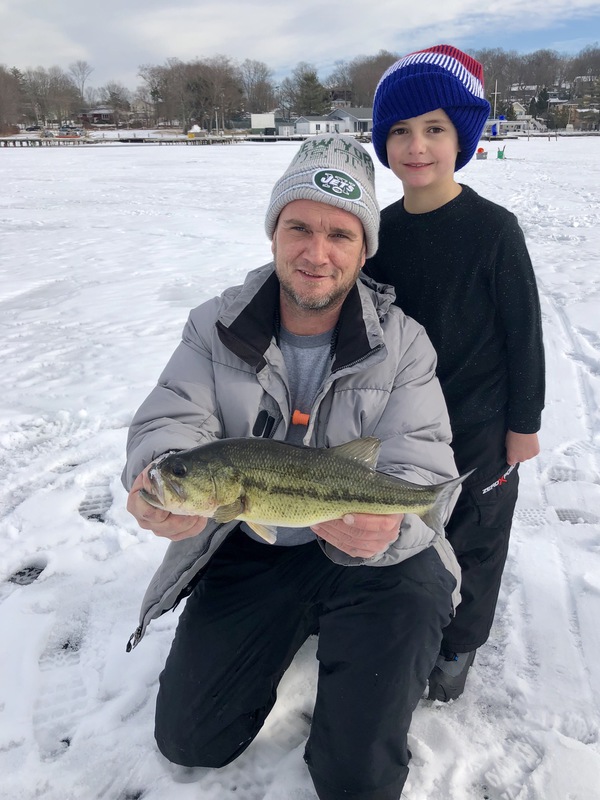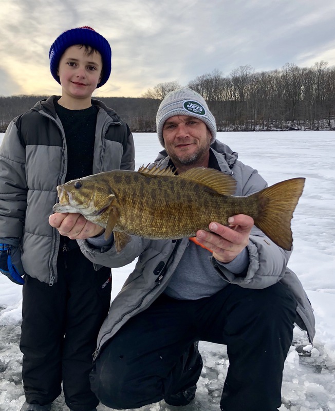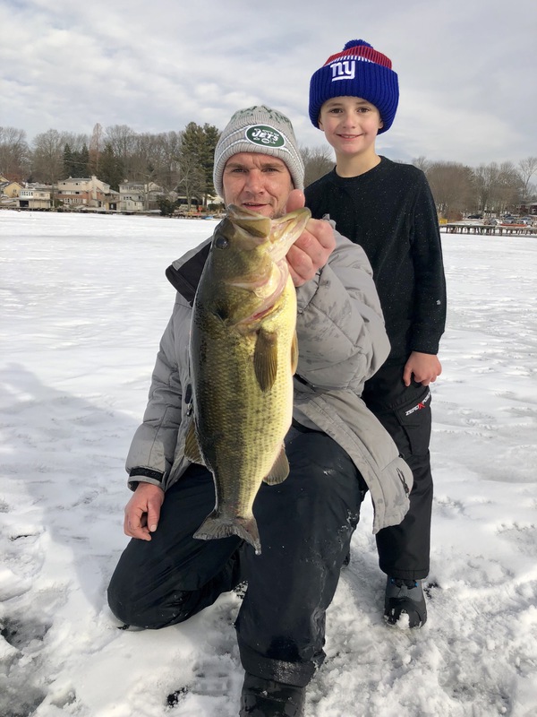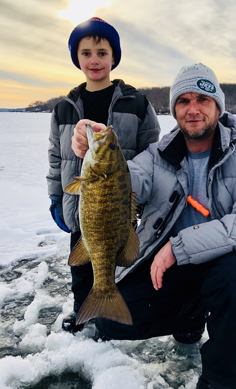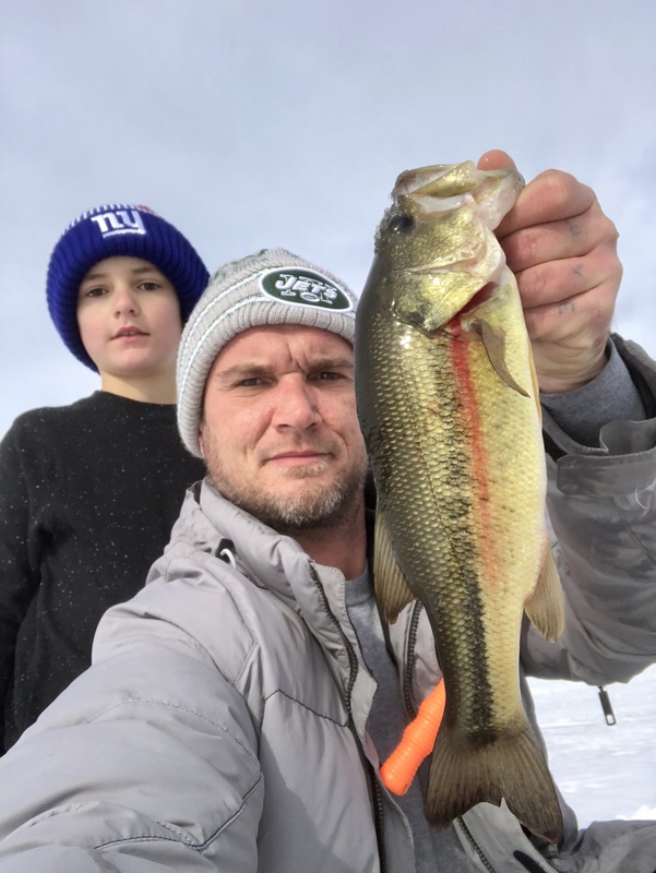 Did some ice fishing with my 8 year old son Chase yesterday! What a day of kicking some Bass! Started off at one spot only to get our butts kicked bright and early. Made a power move around noon and it paid off. My son pulled 25 fish up onto the ice yesterday including 2 fish over 20 inches! Flags were flying in the afternoon guys and gals. 1st monster was a 21 inch, 4.9 lb Largemouth! 2nd monster was a line peeling Smallie that taped out at 20.25 inches and a little over 4 lbs! On top of those 2 breeders we had a bunch of smaller Bass between 15-18 inches. Amazing day with an amazing memory made with my best fishing buddy! Chase kicked some BASS yesterday, with a little help from dad of course. I had to drill the holes, LOL!!! TIGHT LINEZ!!!