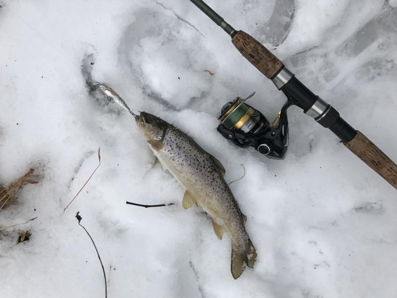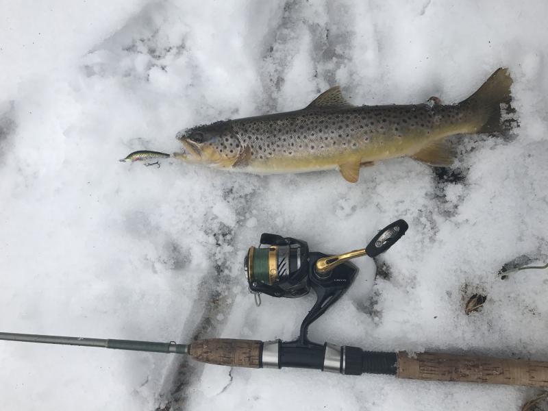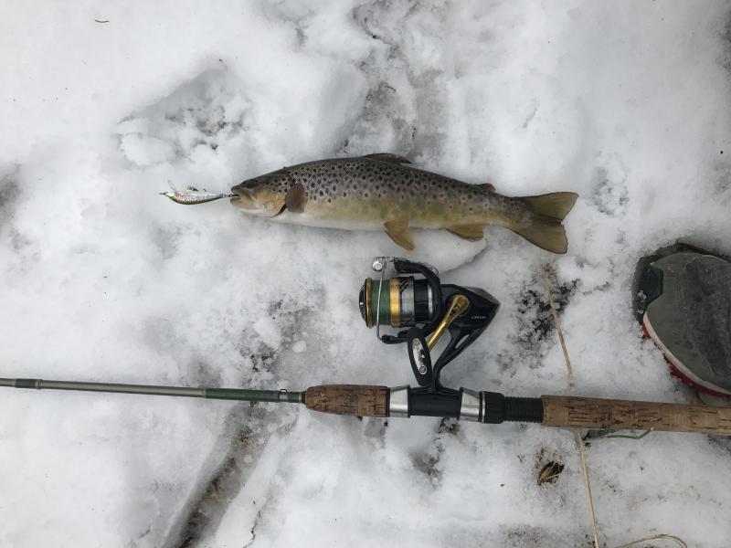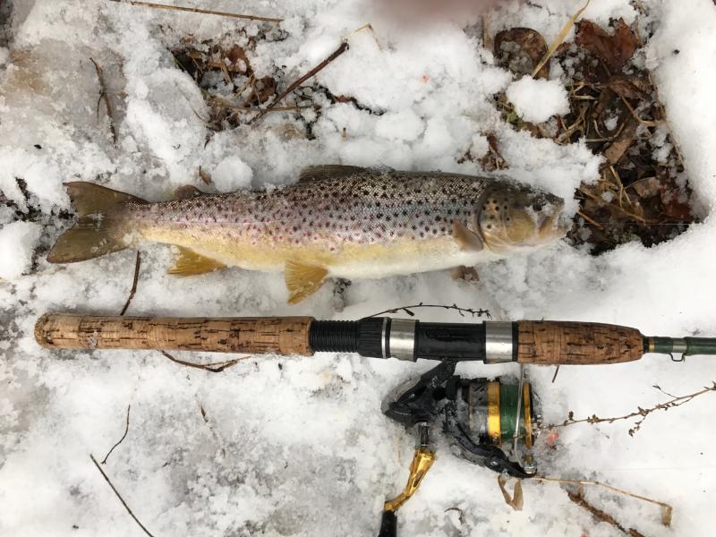 So I have been seeing the nice pictures of browns from time to time on this site and got the itch. I don't trout fish much in Jersey anymore because steelhead spoiled me. However, there is a stream I fished a lot when I was younger and it holds native browns and bows. This stream is not stocked but part of it is designated as wild trout waters. Anyway, in 45 minutes I landed 4 browns and 1 bow and lost two other browns. All fish on a countdown rapala in rainbow finish. Biggest fish about 18" or so. I usually just release trout without taking them out of the water but mother nature was nice enough to provide a soft snow blanket on a 40 degree day. So, no frozen gills and no harm.