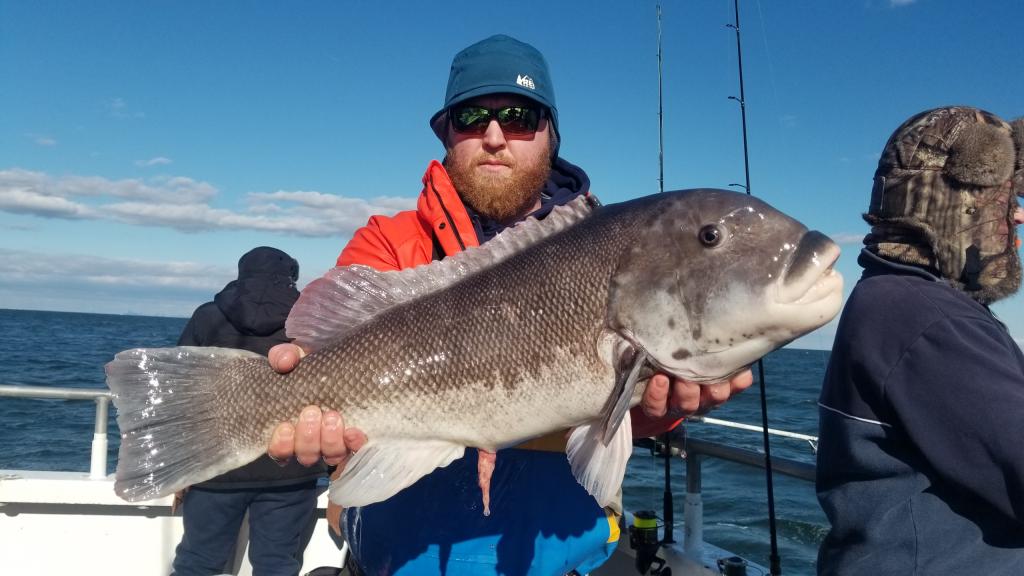 Wow was that a nice day...still a big swell left over but with the west winds blowing it knocked it way down from yesterday...and fishing was very good to us,,,most all day we had a good chew going scattered around the boat...High hooks had a limit but even some first time blackfishermen were catching fish,both keepers and shorts...to top it all off Brendan nailed a Stud of a Tog that pushed 14lbs on the digital scale on the boat....check out the pic here below..also have a video on my facebook page..oh and this fish is not in the seasonal pool so breathe easy...even though we are going to catch bigger this winter!! cant catch em at home people...and the weather all week looks great so come on down...see ya tomorrow. oh and the big male Tog was released to back to the wild..swam away nicely....