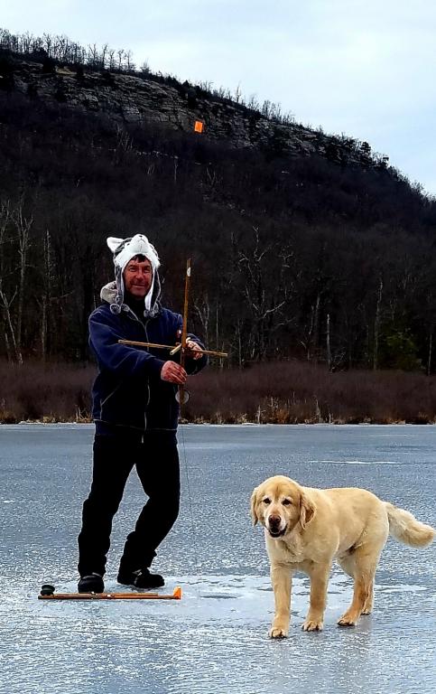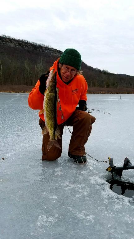 One of the best ice seasons continues into the end of February and my bet is into March. With the questionable forecast for Sunday we made the move for Saturday a few miles North as the crow flies from my lake. Both lakes still locked up solid. This one is one of the best spots with gorgeous panoramic views of the Appalachian mountain ridge. There is just something special about this spot. Great Fishing and Great People.... you know the drill. We also hit the local watering hole for fish stories and coca-colas.