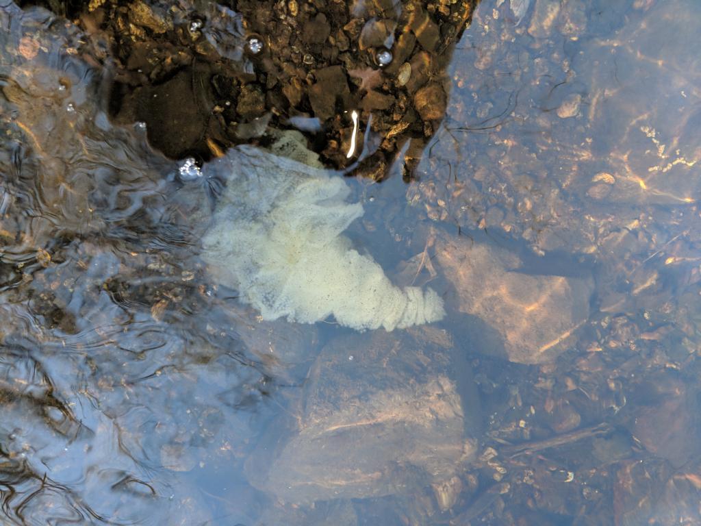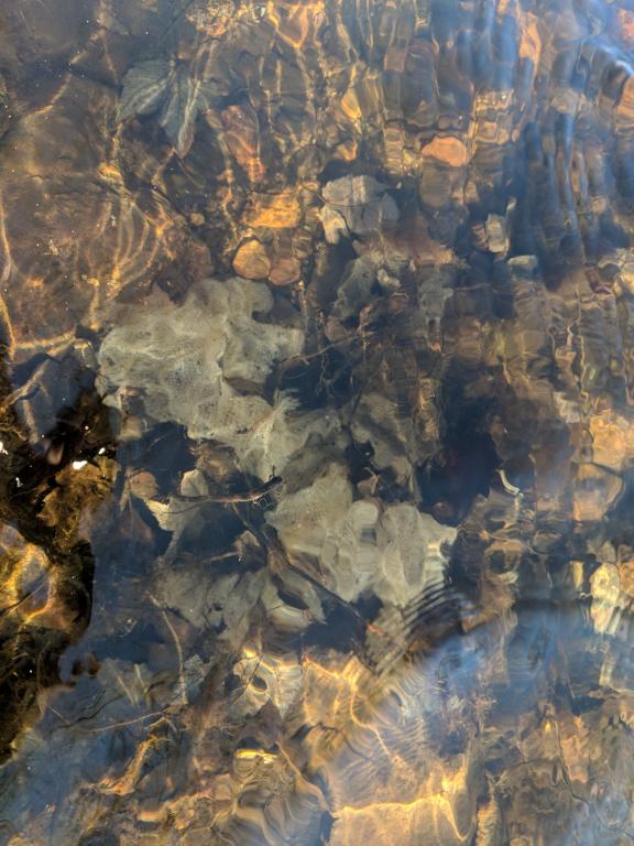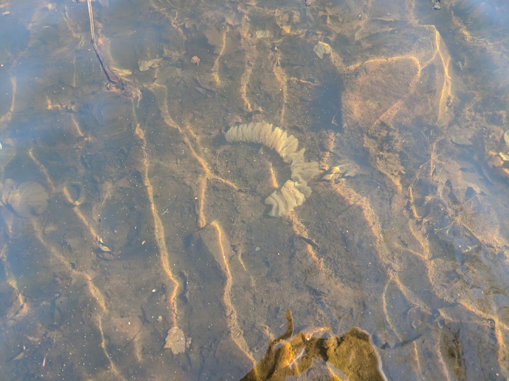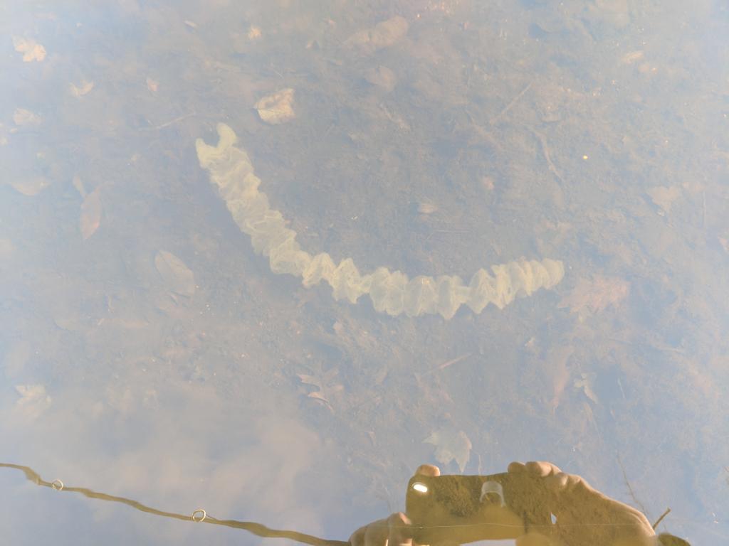 Couple still pictures of the "ribbons" for you to see. They were all over the place. Crazy part is I was fishing maybe a football field away and catching non spawned out females and males which were probably still staging awaiting the call of nature to spawn. Those fish were hitting the bobber jig presentation, the fish in the video as mentioned around the ribbons were not. Natures way I'm guessing of guarding the eggs against predators.
