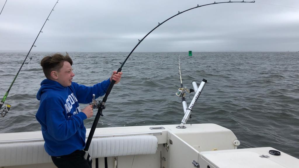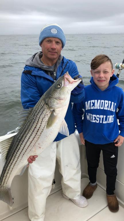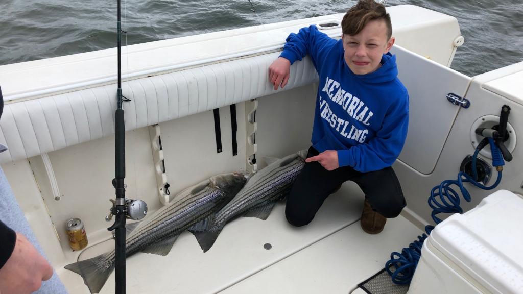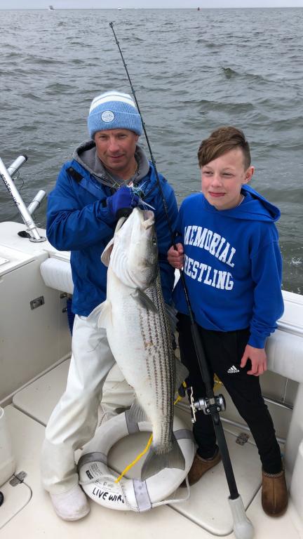 Past three weeks of wrestling Tournaments and coming out on top to wrestle in the finals May 4 and 5 in Maryland, We finally get our son Logan Striper fishing. He had the biggest at 40” No match for our 80lb stud. Thanks Al for putting us on the fish today! Over 25 caught and released only keeping our 6. Spring stripers at its best!