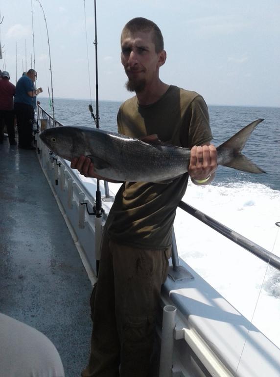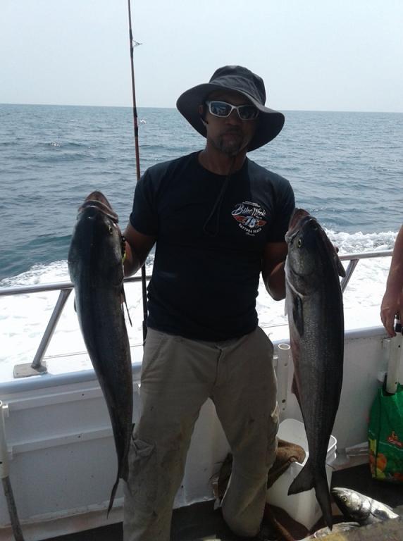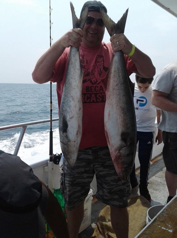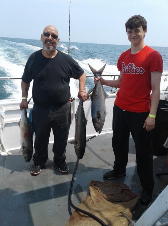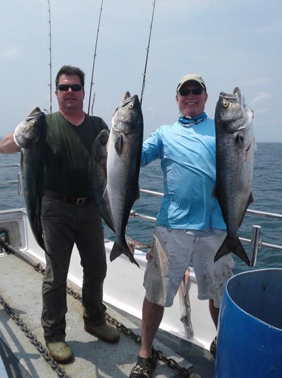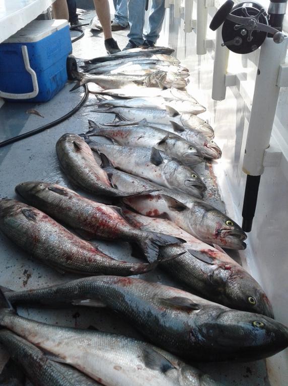 It was absolutely SUPER fishing today. We got into the JUMBO BLUES and you could catch as many as you wanted. The pool winner was about 14 to 15lbs. or maybe a little more. It was all on jigs and within a half hour of the inlet so plenty of fishing time. If you just stayed at the rail you just kept catching them. We also had a DECENT catch of SEA BASS before the BLUES showed up.