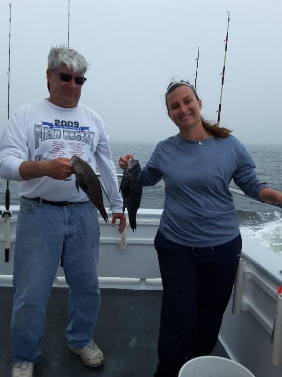 Even though it was raining today, the ocean was calm and it was EXCELLENT SEA BASS fishing. We had a complete boat limit of SEA BASS and some LING. We caught a few BLUES but not as many as yesterday.