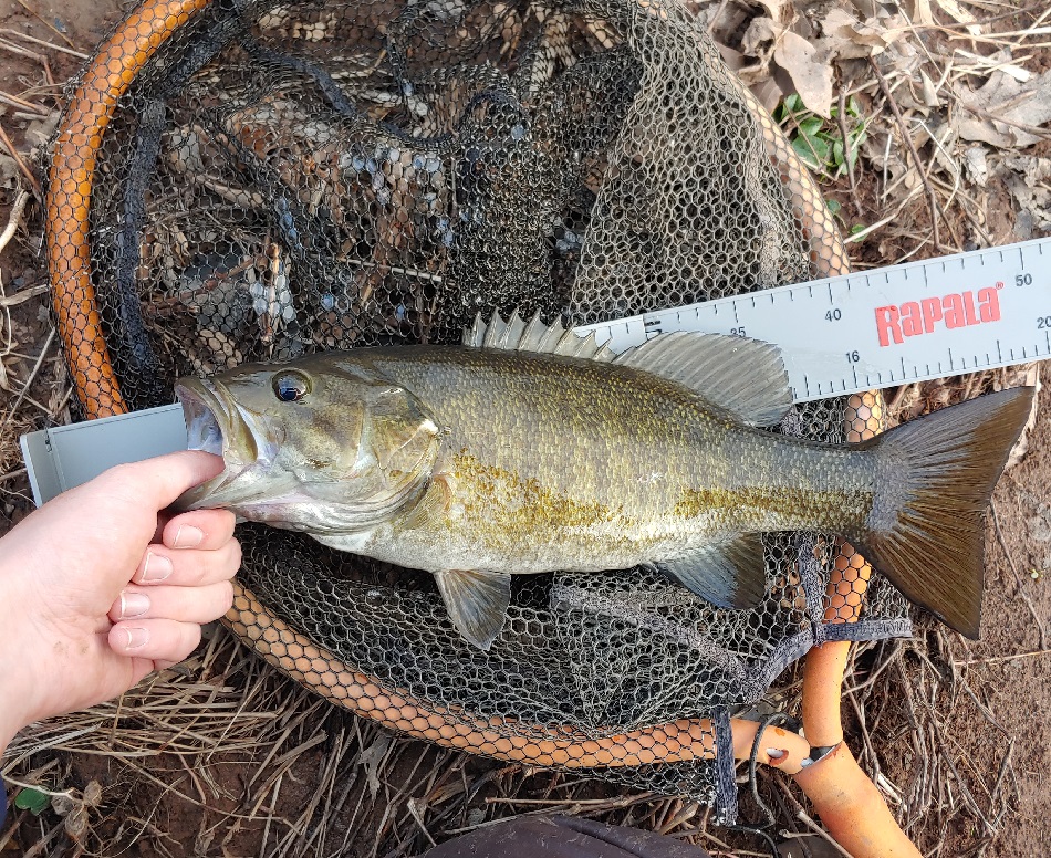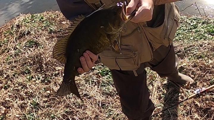 Casting out into the river, off of the log where I hooked the chain pickerel, would be 4 back to back hits, three of which I landed were smb.