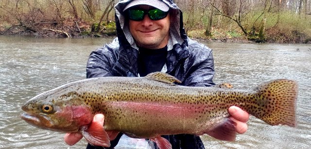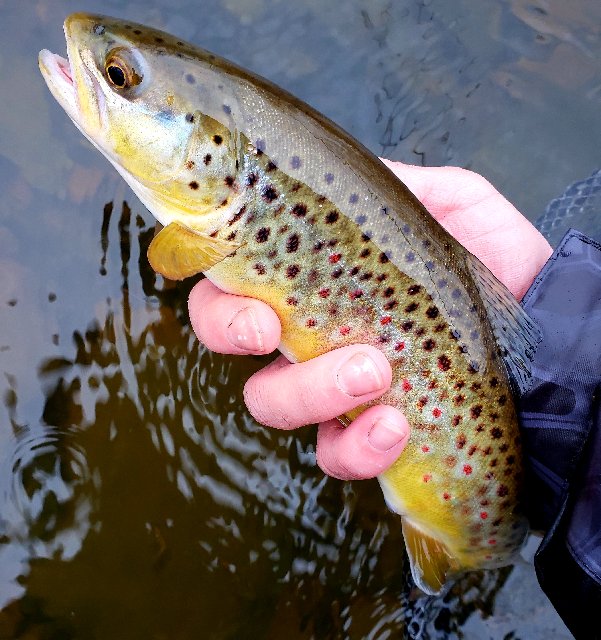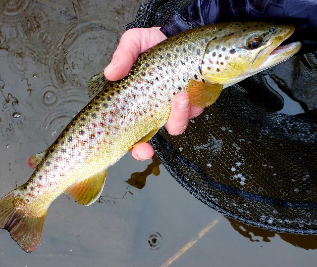 Headed out Sat am despite the dismal forecast. Glad I did. It rained on and off, but the fish were charged up. Caught a bunch of wild browns, a pickerel and a monster rainbow at 23+" at the last stop of the day.