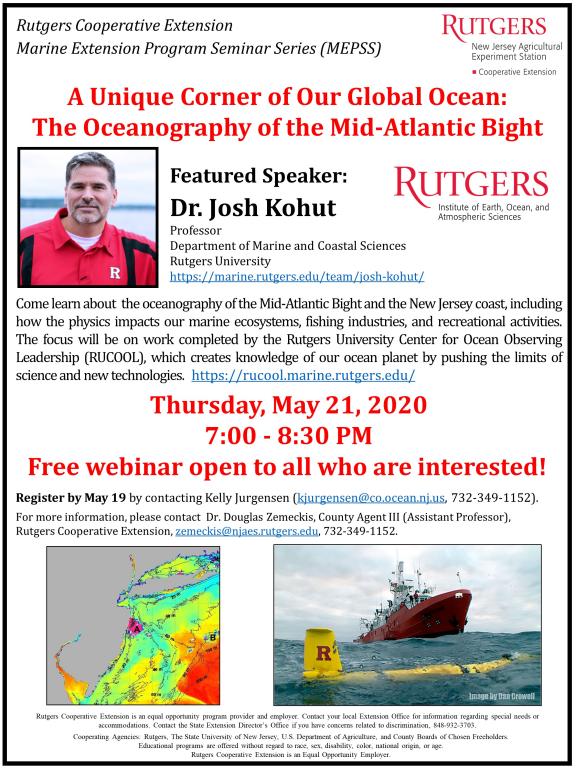 The next seminar as a part of our Marine Extension Program Seminar Series (MEPSS) with Rutgers Cooperative Extension (RCE) will be on Thursday, May 21 from 7:00 - 8:30 PM.