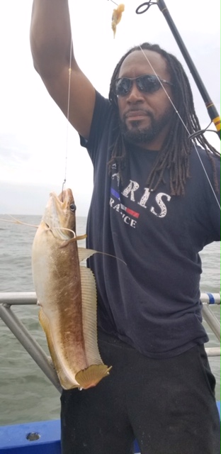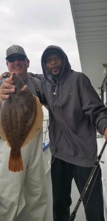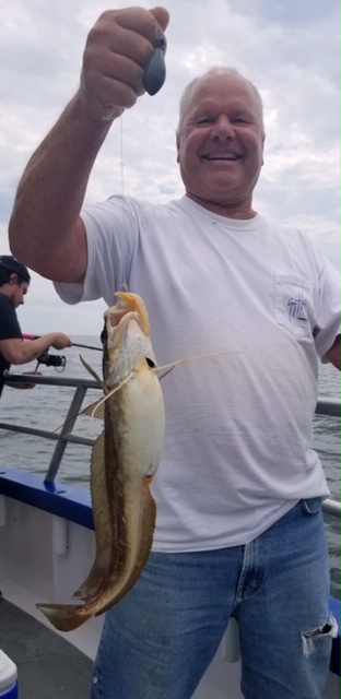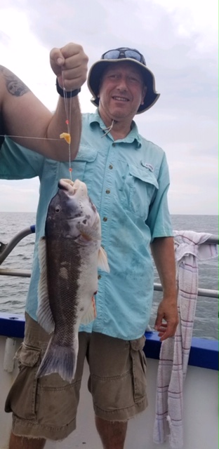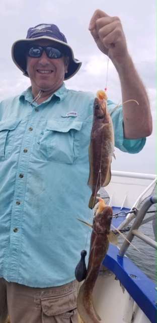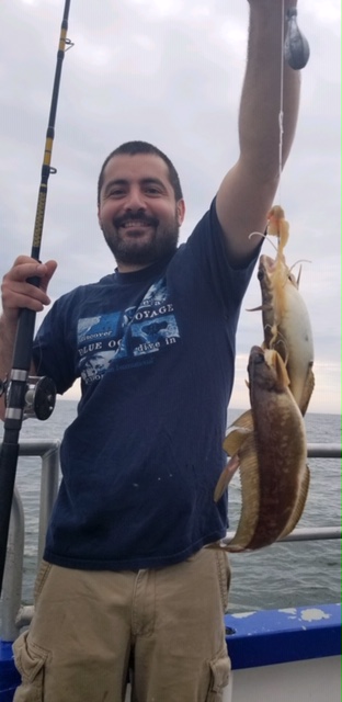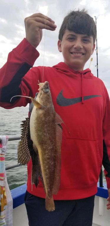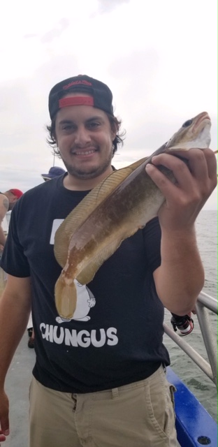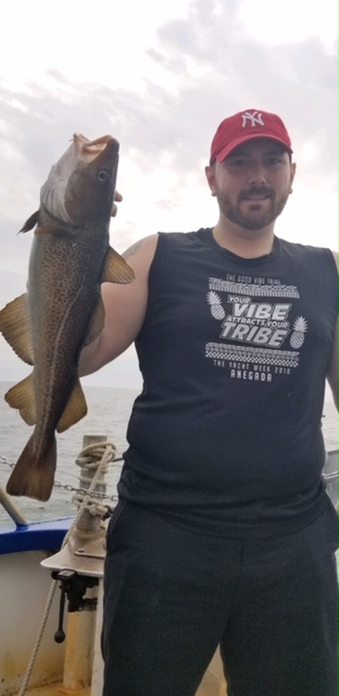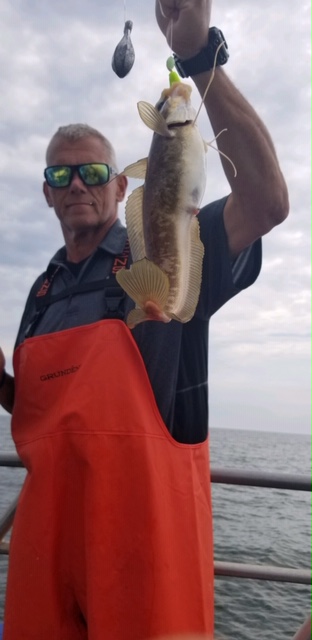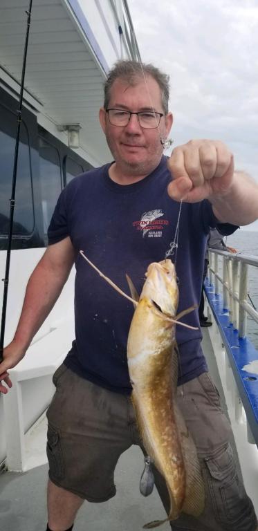 The bow was hot today. Dave Brink and Danny Benbrook of Middletown were banging away at nice ling all day. They had a nice catch of fish in their cooler. Doug, fishing the bow was hot catching all big ling, keeper codfish and released an 8 lb. blackfish. All in all a very good day again ling fishing. The ocean was nice again today. We did not get any of the thunderstorms people were worried about. I have some spots open for tomorrow, Sunday. I plan on staying bottom fishing for a while. So please don't ask me about fluke. Call me on 732-245-6514 for reservations.