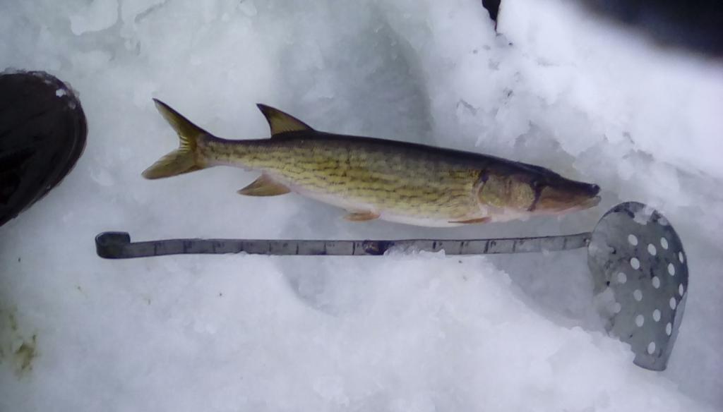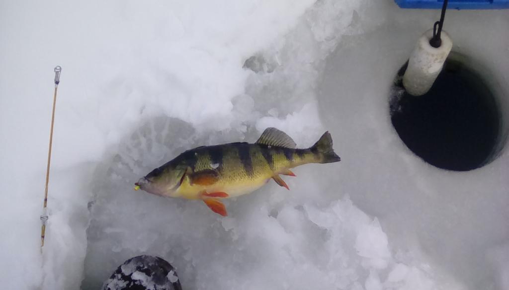 After half day due to the weather yesterday i went back to cranberry lake today to pick up where i left off. it took some time and many holes drilled to find fish but at last i found fish that wanted to play. I first got a decent perch by this point then moved to the next hole about five yards away and got my second largemouth bass of the season then had to move a bit to find them again.The next 6 holes were a bust then the 7th one was the honey hole of the day i got another lmb a bit bigger than the first one and then got mugged by 6 slime darts i got the bass on a rippin rap then the slime darts moved in so i went to my #1 jig the marmooska meal worm combo thinking the slimers would leave that alone, WRONG got two more on that.. the last one was the biggest one of the day at 17" Good thing they did not snap me off had to retie after each one