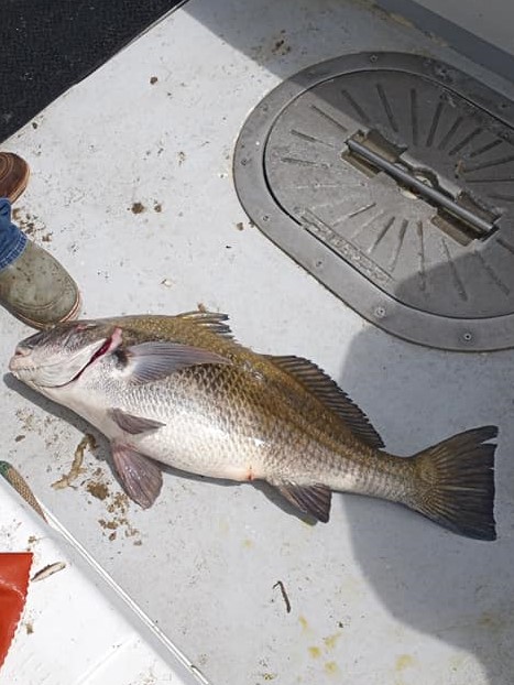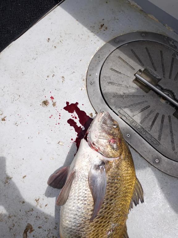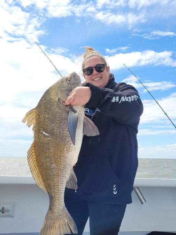 Headed out with Capt Tom for an afternoon of drum fishing. Beautiful crew of myself, Dev,Frankie Ocean & Vin Ragu. Wind was blowing steadily out of the northwest/west & water was filthy, also a bit colder than we would like at 59-60degrees. Screen was full of drum as we set tight on anchor & we could see them pushing under the boat on the finder but they wouldn't eat. Had some skates & capt Tom decided to push down to another area, same thing read them on the screen & could hear them. Finally rod goes off & dev fights & lands her #31specie a little black drum of 15-20lbs perfect size to kill! We had a few bites after that but nothing came tight. Everyone was just happy to see dev land the drum. Now to prepare for Sea bass