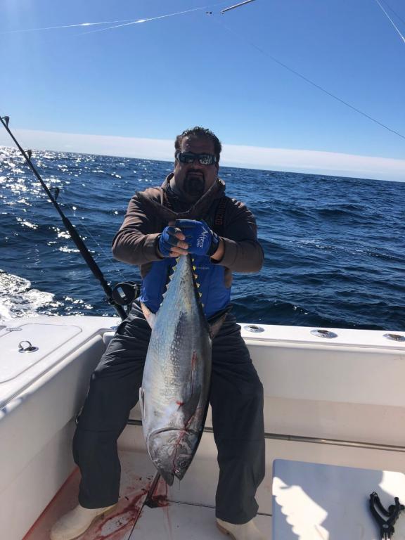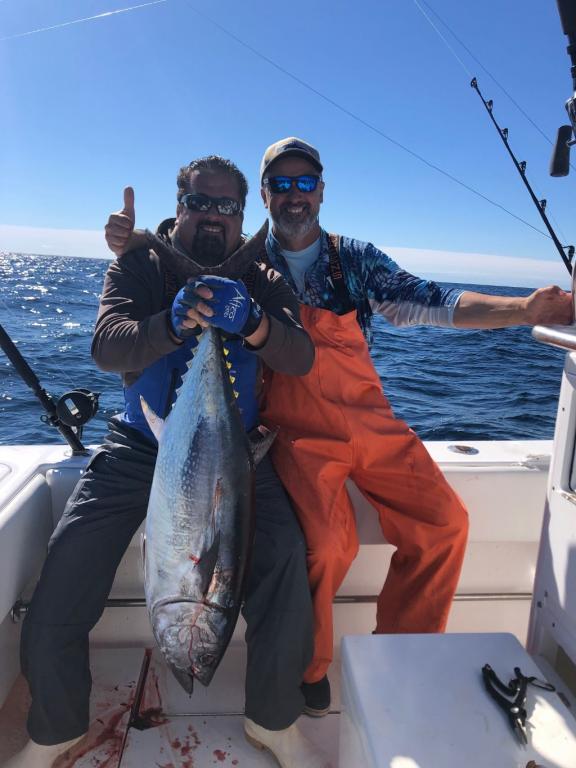 Good day tuna fishing with Tony and Al. Thank goodness we didn't pay attention to the weather forecast, it kept most at the dock today when the weather was perfect! When we found the whales it was game on!