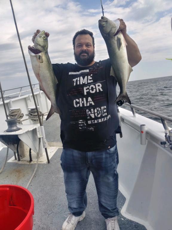Awesome jigging today! Big areas of blues on top "White Water". Plenty of readings super action. Limits around the boat! Ava 27's and 47's both worked on 3 to 8 pound blues.