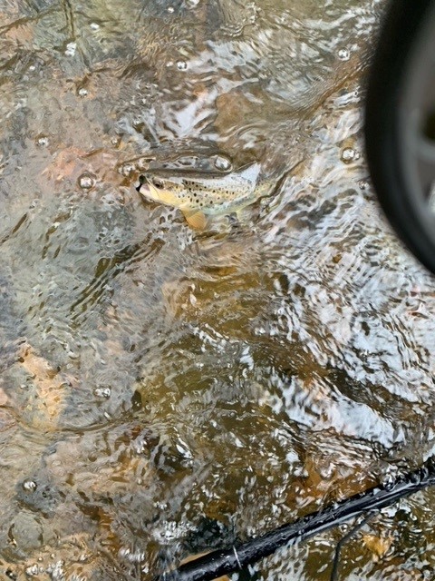 Reached into my bag of tricks and found a place that was high but clear and with NO ONE in sight. Got in a few hours of fishing before the damned rain started back up again and muddied up the stream. Oh well, the wild browns came to play and a good time was had by all. ![]()