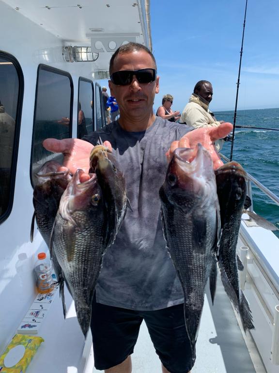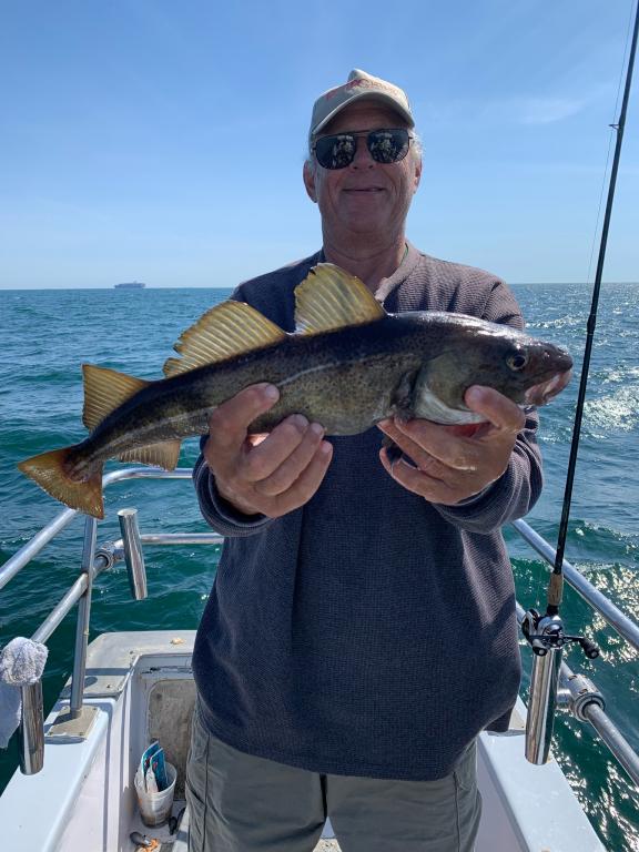 It was a gorgeous day today and it started out very good on the first drift catching fish and then the tideline came through, the breeze picked up and we started to move too fast. So, we dropped the anchor and the fish did not want to bite so it was just a pick. It was okay early and we did catch some SEA BASS, COD and LING.