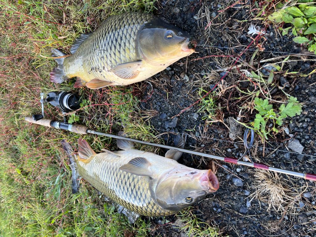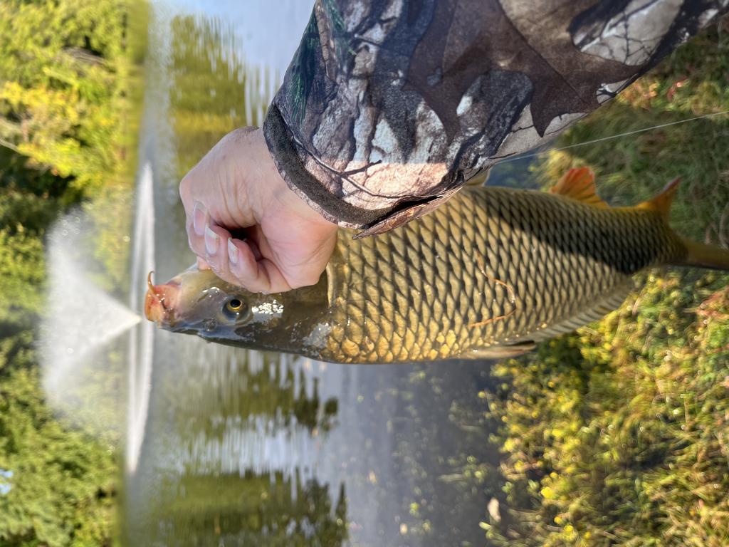 After catching 1 bluegill in the Millstone River Friday evening, then nothing in Veterans Park Lake yesterday evening, I had constant action in 68 degrees Colonial Lake this evening in the rain with a double rainbow to the east. Threw out a can of corn for chum, then caught 7 bluegills, 3 golden shiners, a 13.5” brown bullhead, a painted turtle and 8 and 7 lb common carp with ShopRite canned whole kernel corn on a #4 long shank gold hook and 12 lb test line. Lost 2 big carp. Landed 58 carp and 70 turtles this year