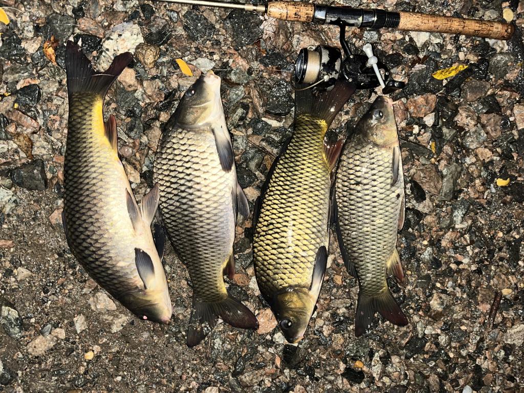 Went carping in the 60 degrees Millstone River on the north shore in Plainsboro, NJ, this evening in the rain during a nor’easter. Threw out a can of corn for chum then caught 4 common carp with ShopRite canned whole kernel corn on a #4 long shank gold hook and 4 lb test line on my Mitchell Avocet reel and 12 lb test line on my Mitchell #300 spinning reel. Caught 2 fish on each reel. Had my first hookup on my first cast of the day while I was talking on my cell phone with a Trenton fire chief. Landed the last carp on my last cast of the day at 7 PM. Caught 80 carp this year.