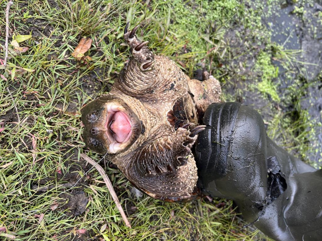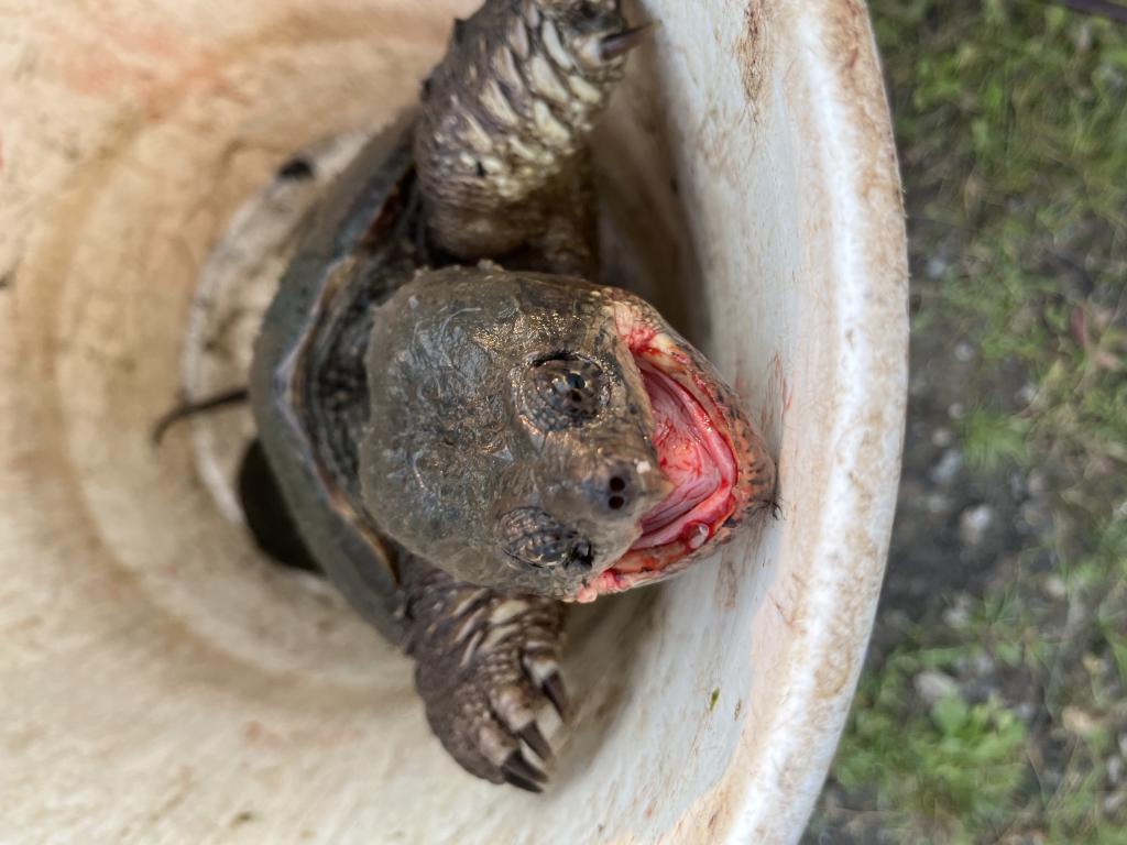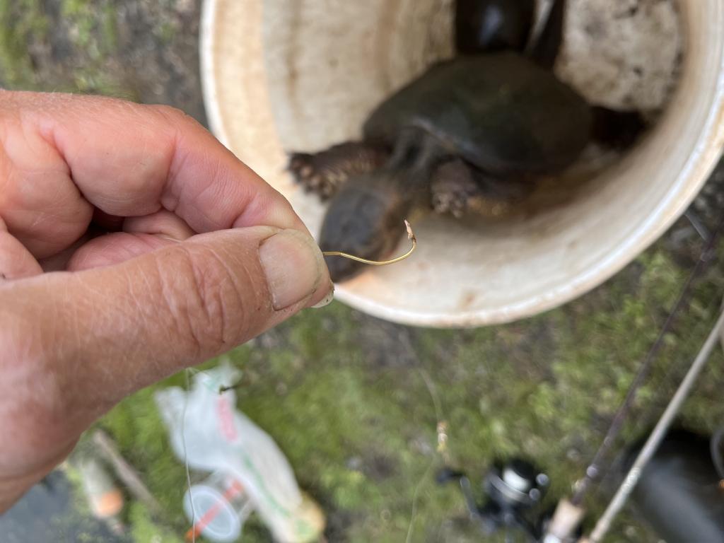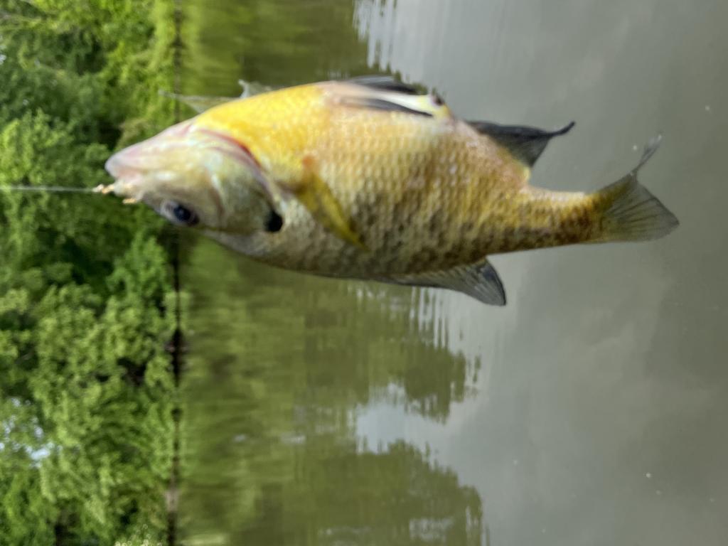 Went fishing in 76 degree Colonial Lake in the rain 🌧️ again this evening on a warm, cloudy day with a moderate west wind. Two fishermen were to the left of my spot and caught nothing with red worms. They gave me their bait when they left. I showed them how to catch fish 🎣 with a #14 gold treble hook on 2 lb test fluorocarbon line and no bait. After I threw out a can of corn 🌽 for chum, I caught and released my limit of 25 fish 🐟 consisting of 23 bluegills, a pumpkinseed sunfish and a golden shiner. The female bluegills were still gravid. The two intruders to my right caught nothing. After I limited out, I caught and released 2 painted turtles 🐢, and a 7 lb snapping turtle on my last cast of the day with whole kernel corn and red worms. Caught and released 19 turtles this year.