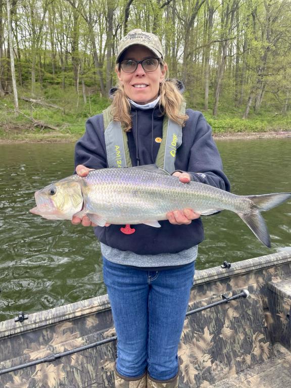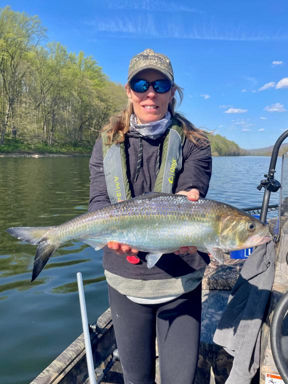 I wade fished Thursday morning and had 15 in a few hours of fishing before heading out on the boat . Thursday afternoon got crazy and we boated 75 in less than 5 hours of fishing . Friday we fished the afternoon boating 45. Saturday I fished solo in the morning boating 42 , Tracey and I added another 27 in the afternoon for a total of 69. todays weather looked to be the best , and had expectations of another great day , fish had a different idea . Where huge schools had been for a week were gone . I ran about 5 miles north looking for those pods . only catching 3 stragglers . 207 shad made it into the net during the 4 days . Lots of cookie cutter roe between 4# and 4# 2 Oz . but nothing worthy of a weigh in . great weather , fun fishing still made for a great week . CONGRATS to those that placed Couple pics