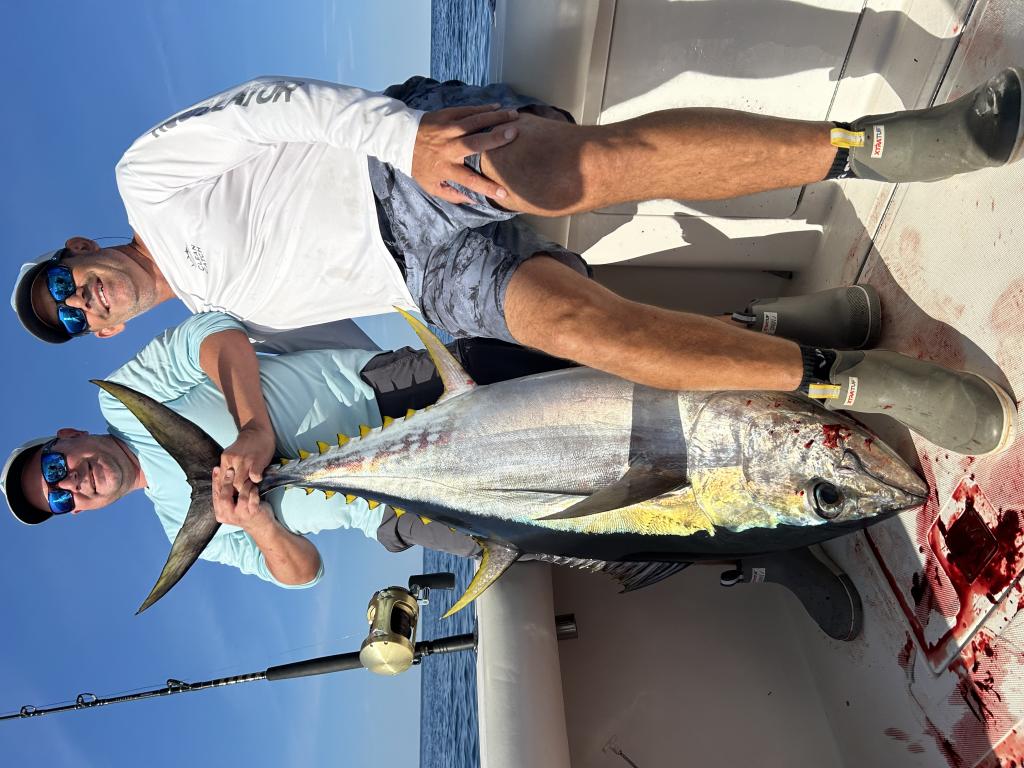 Headed back out with the A team Tuesday night, ran way south to the bottom edge of the eddy, only a few boats, trolled north for a few hours into the break and had a triple shot of big eyes, one broke off quickly the other 2 were leadered until angler error snapped one pole in half, only option was too free spool that fish so we landed the 2nd, lost the other due to to much slack but with only a reel and no pole it was really impossible. Trolled a couple more hours landing 5 yellowfin. Good trip and crew. Bite broke wide open in afternoon on poppers but we were home by then.