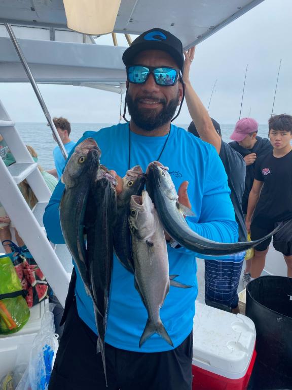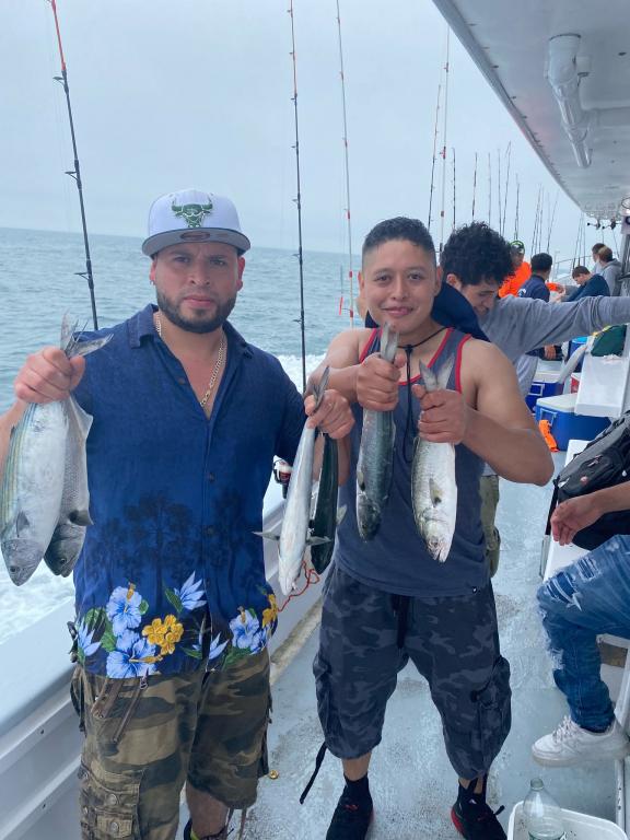 There were limits of BLUES around the boat with GREAT ACTION on all drifts. The BLUES were 2 lbs. and Diamond jigs, plain and tailed, both worked great. The fish were high up in the water about 20 to 40 feet down. We also had a good showing of CHUB MACKEREL on jigs and bait.
