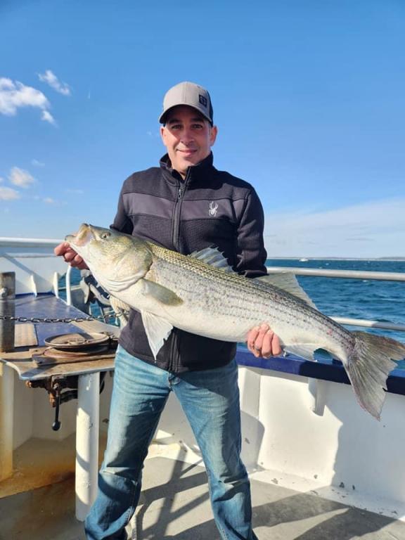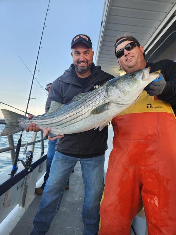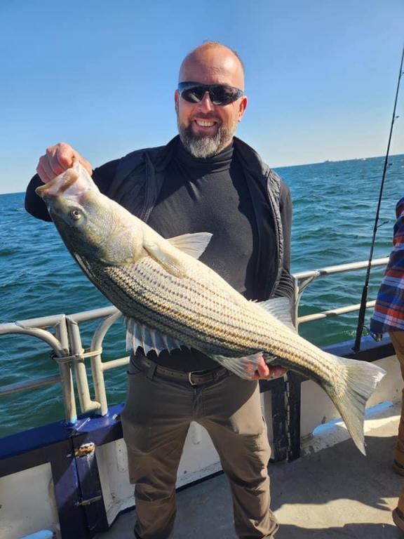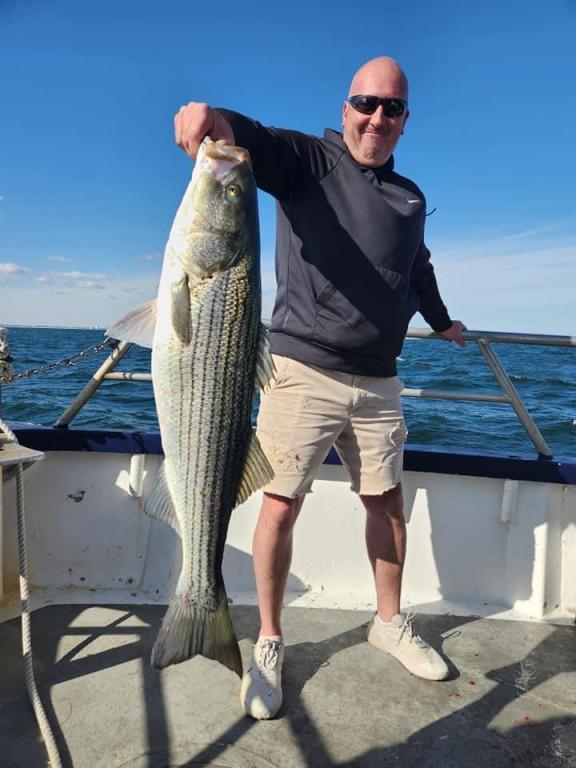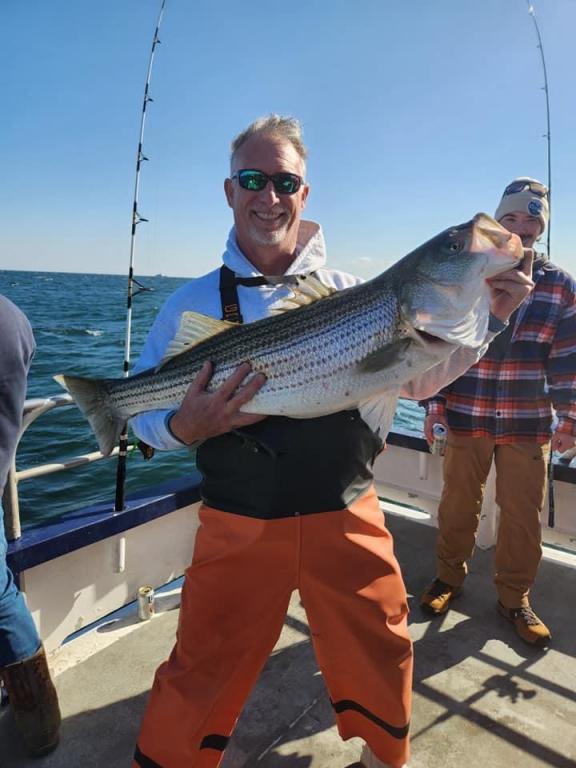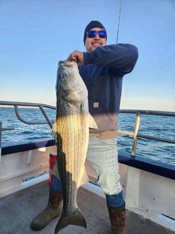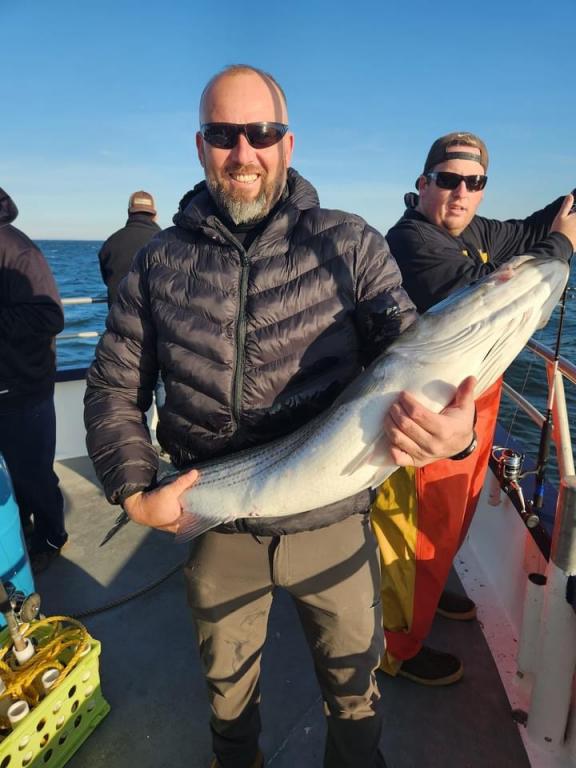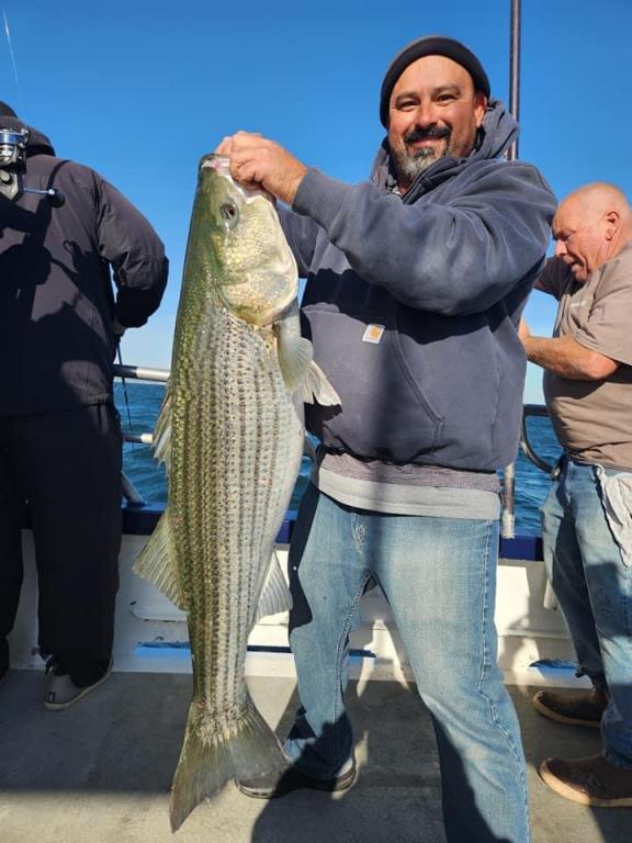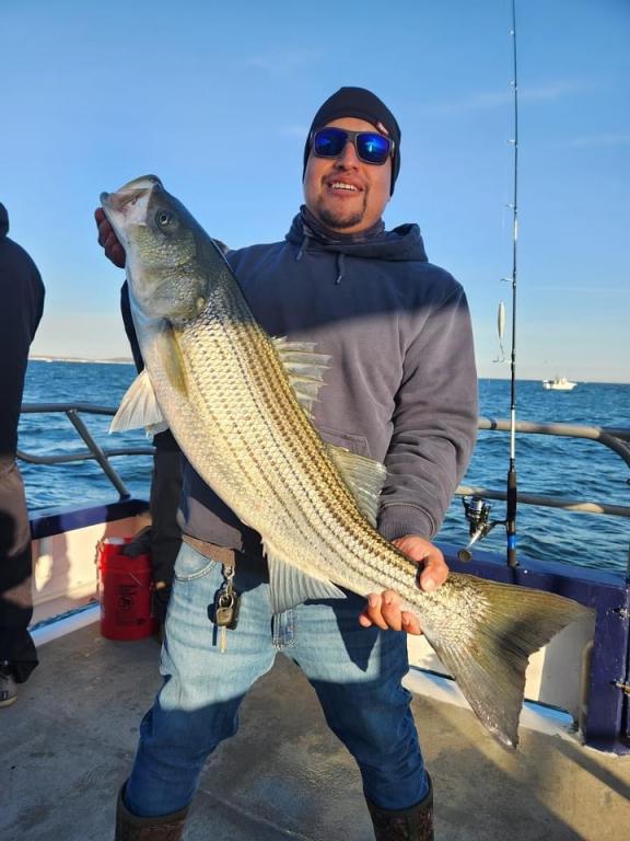 Hey gang, it has been fun to come out on the ocean last few days. We got into those big beautiful bass again today. They were biting all day. We have the other half of the Fletcher Creamer Charter onboard, and they did a fantastic job of catching large striped bass. Bridget landed a couple beauties, Raul had in the double digits, and Greg took the pool with a beautiful 46inch fish. On behalf of the crew and myself, it was a pleasure to fish with this group today. Don't miss out on this fantastic bite! Capt Jack will be at the helm tomorrow, Sunday the 27th. He is definitely going to put you on the meat, so do not miss out! I will be back at the helm Monday. Fare $90, spinning rod rental $10. Bring your diamond jigs!